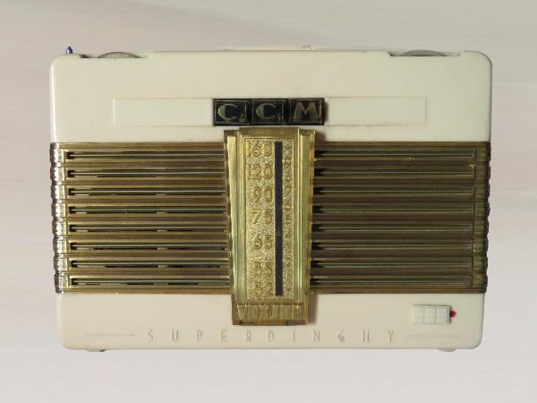 Apparecchio radio compatto portatile a forma di valigetta con maniglia. Il mobile è in materiale plastico bianco con una griglia orizzontale color oro nella parte centrale. Dietro alla parte sinistra della griglia è inserito l'altoparlante magnetodinamico circolare, al centro si trova la scala di sintonia posta in verticale, ad indice scorrevole con indicate le frequenze. Sopra alla scala tre pulsanti permettono il cambio della gamma d'onda. In basso a destra, sulla parete frontale, si trova un deviatore a slitta per l'accensione dell'apparecchio. Nella parte superiore sono inserite due manopole, che fuoriescono solo in parte dal mobile, per regolazione volume e sintonizzazione ed un'antenna telescopica estraibile. \nLa parete posteriore è forata per permettere l'aerazione ed aprendo il pannello posteriore è visibile il circuito supereterodina a 4 valvole con due circuiti in modulazione di ampiezza (AM).