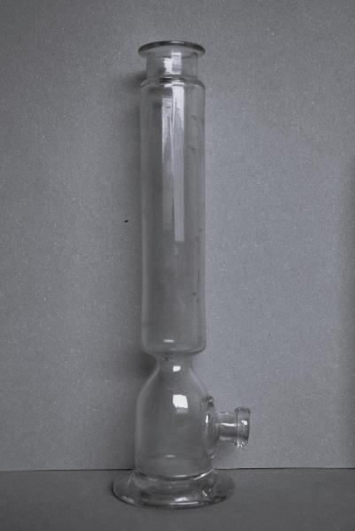 Contenitore in vetro trasparente di forma composita: la base, più corta, è costituita da un calice rovesciato, con fondo piatto e una bocchetta cilindrica inserita sulla parete esterna; seguono una strozzatura e la parte superiore del corpo, di forma cilindrica e allungata. L'imboccatura superiore è predisposta per la chiusura con un tappo.\n
