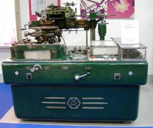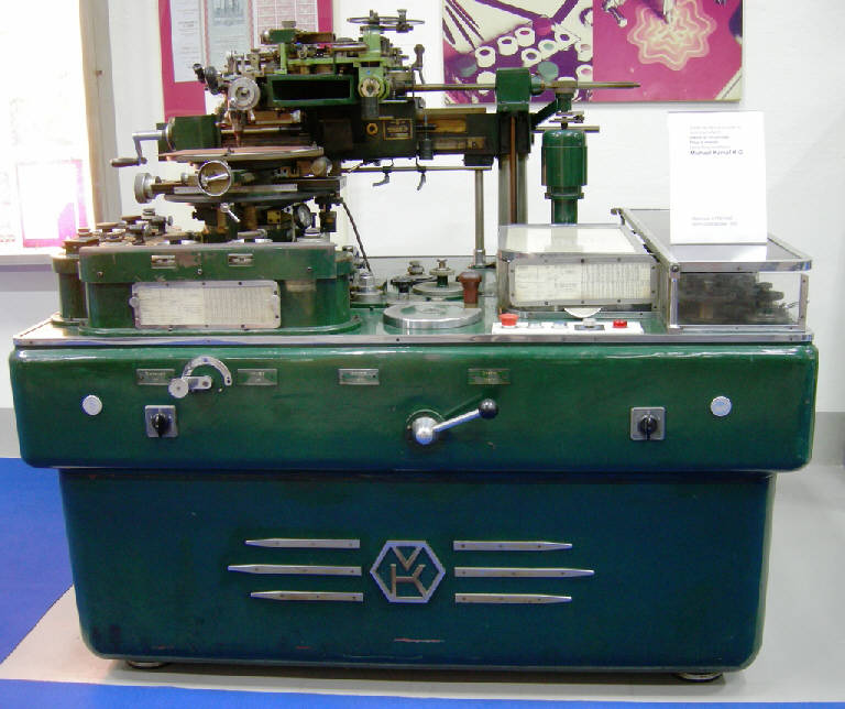 Apparecchiatura Guilloche di tipo A III "NOVA". Sistema meccanico per la realizzazione di trame di sicurezza, fregi e rosoni (guilloches) per le decorazioni delle carte valori.\nCompleta di armadio metallico contenente serie di ingranaggi e utensili, armadietto metallico contenete, appunti, schemi produttivi, lastre incise e da incidere.