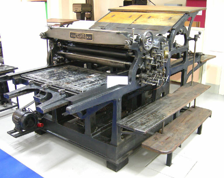 macchina per stampa tipografica "Optima" Nebiolo, funzionante con cinghia ad albero centrale. Puntatura del foglio a mano