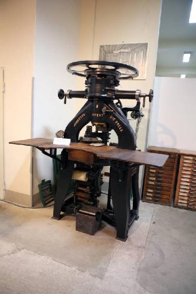 Pressa per stampa in rilievo\nJohnston Patent Die Presse n. 1504\nFunzionamento manuale o con cinghia di trasmissione.\nMacchina brevettata "Johnstonia Engraving".