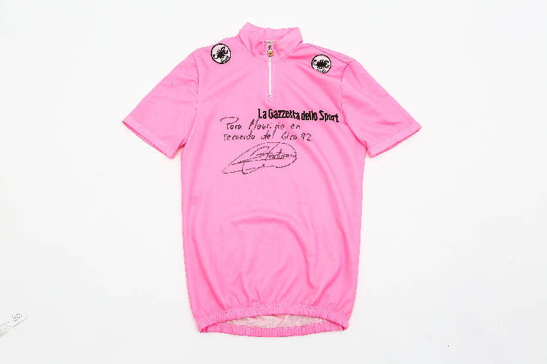 Maglia rosa in tessuto tecnico sintetico, girocollo con cerniera, tasche posteriori senza bottoni, stato di conservazione ottimo, dedica fatta con pennarello nero sul fronte "Para Mauricio, en recuerdo del Giro '92", dedica di Indurain a Maurizio Castelli, titolare del maglificio, sul fronte, su entrambe le spalle, marchio Castelli.\nGrazie all'iniziativa Giro for Ghisallo, promossa da Gazzetta dello Sport e curata da Federico Meda, la maglia è stata donata a Rcs da Vittorio Castelli, figlio di Maurizio, titolare dell'omonimo maglificio grazie all'iniziativa Giro for Ghisallo promossa da Gazzetta dello Sport e curata da Federico Meda ed è attualmente in prestito ed esposta al Museo del Ghisallo a tempo indeterminato.\nE' una maglia non utilizzata durante la corsa, gli sponsor di quella edizione, (vedi foto) erano Banestam, Nalini, Campagnolo e le maglie nelle foto del Giro sono prodotte da Santini. \nMa è una maglia molto importante perché segna il grande legame affettivo del Campione con Maurizio Castelli, all'epoca comunque fornitore della squadra.