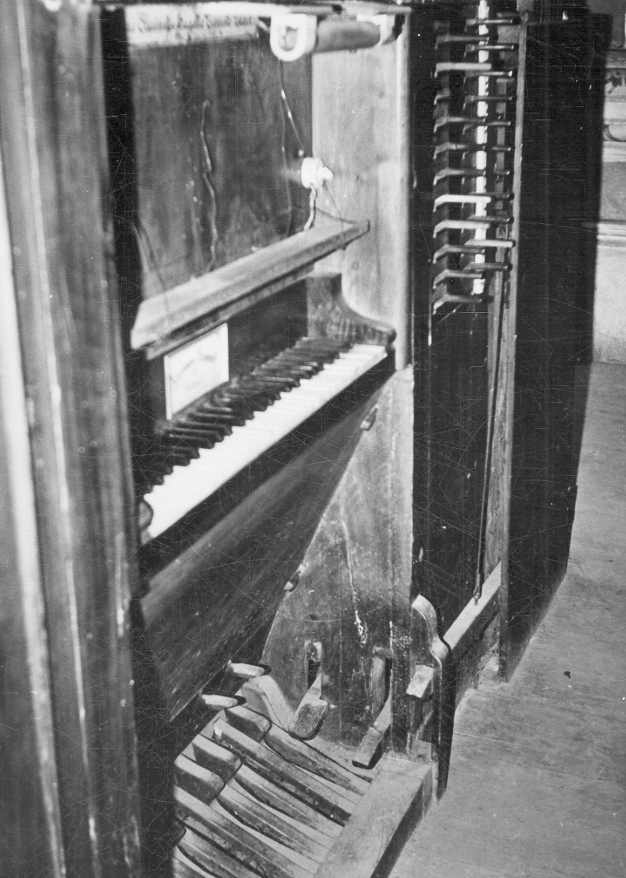 L'organo è racchiuso in cassa di legno addossata alla parete con lesene ioniche e decorazioni color marrone