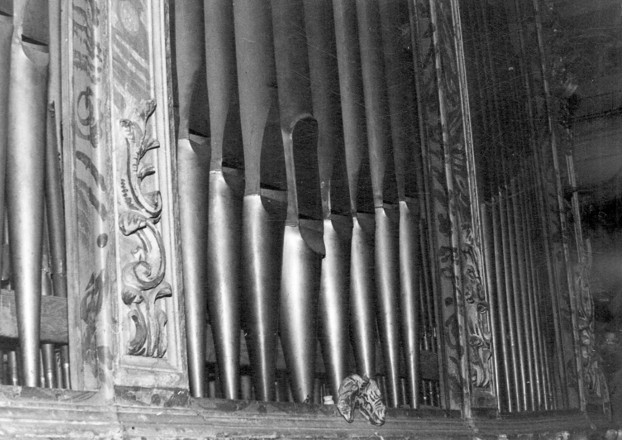 - NOTIZIE STORICO CRITICHE Lo strumento non è attribuibile con certezza in quanto il cartellino posto sul frontalino della tastiera con la firma dell'autore è quasi completamente strappato e comunque illeggibile. Non sono reperibili documenti attestanti l'origine dello strumento. Il disegno della cassa, il materiale delle canne, la meccanica e il tipo di somiere (a tiro) fanno supporre che l'organo abbia origini settecentesche-ottocentesche. Lo strumento ha subito alcuni interventi nei primi anni del Novecento che ne hanno modificato la struttura fonica e meccanica originale: i registri, un tempo inseribili per mezzo di manette, sono ora inseribili per mezzo di tiranti a pomello (sono ancora visibili gli spazi vuoti per le manette); il Ripieno è stato raggruppato in file, alcuni registri da concerto sono stati sostituiti con quelli violeggianti
