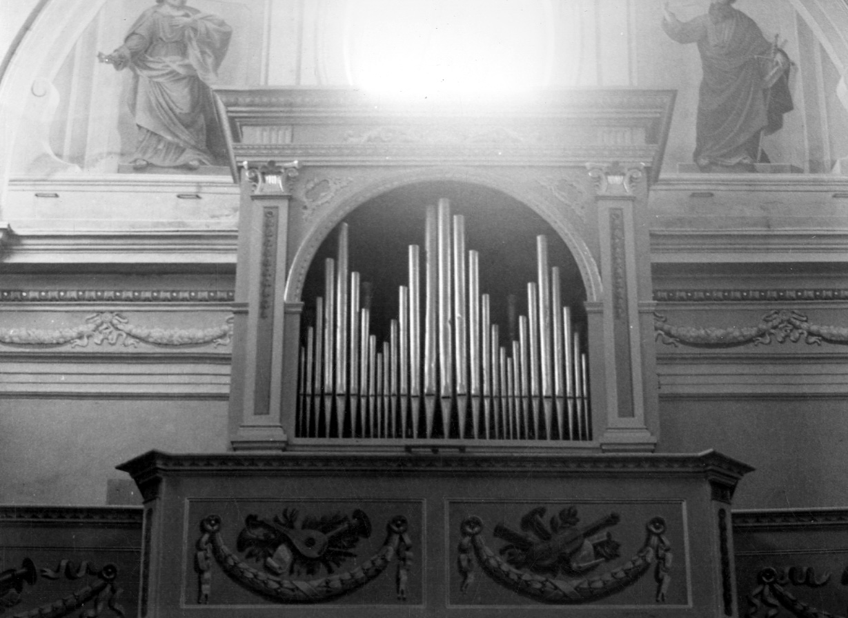 La cassa, addossata alla parete di fondo, è in legno dipinto