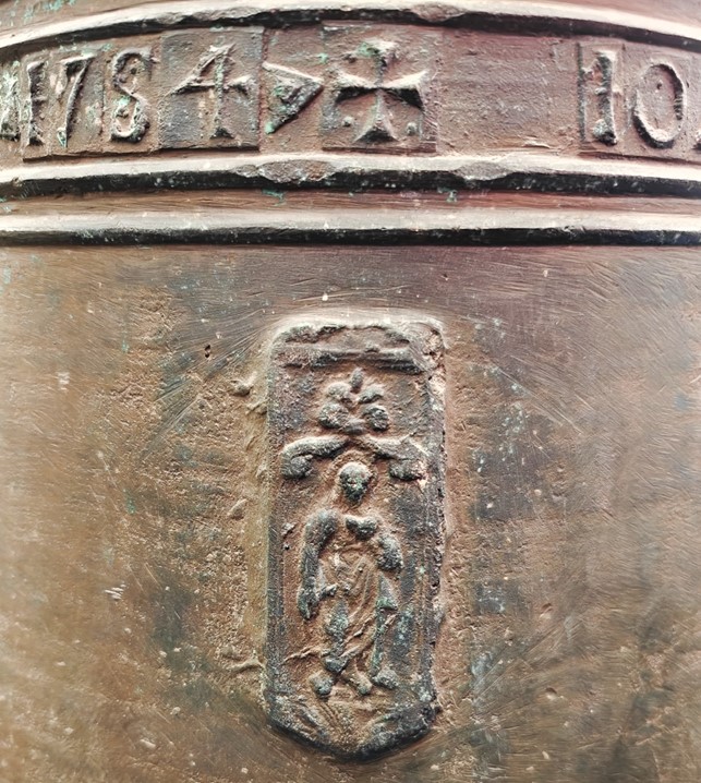La campana datata nella metà ‘700 è completamente aperta sul retro da una lesione verticale che la taglia dalla calotta alla base. Nella faccia principale c’è una piccola formella (8x4cm) di forma oblunga, decorata agli estremi, che contiene in bassorilievo san Pietro a figura intera, poco nitida e di semplice realizzazione artistica. Sul retro essa è caratterizzata da due vistose croci sovrapposte (11x7cm) simbolo di san Pietro a cui è dedicata la campana. Nell’iscrizione c’è infatti la richiesta di preghiere da parte del Santo. La campana è percorsa da coppie di linee parallele di 2 differenti spessori che ne limitano i campi dalla base fin sotto la testa. Qui formano due righi per la collocazione delle tessere con le lettere di dimensione variante tra 1,2X1,8 / 1,8x2cm. Come consuetudine l’incipit di ogni frase è segnato da una piccola croce greca. Il secondo rigo si concluse originalmente con una stella a 6 punte. La testa della campana è a ventaglio con tre ampi fori a goccia capovolta
