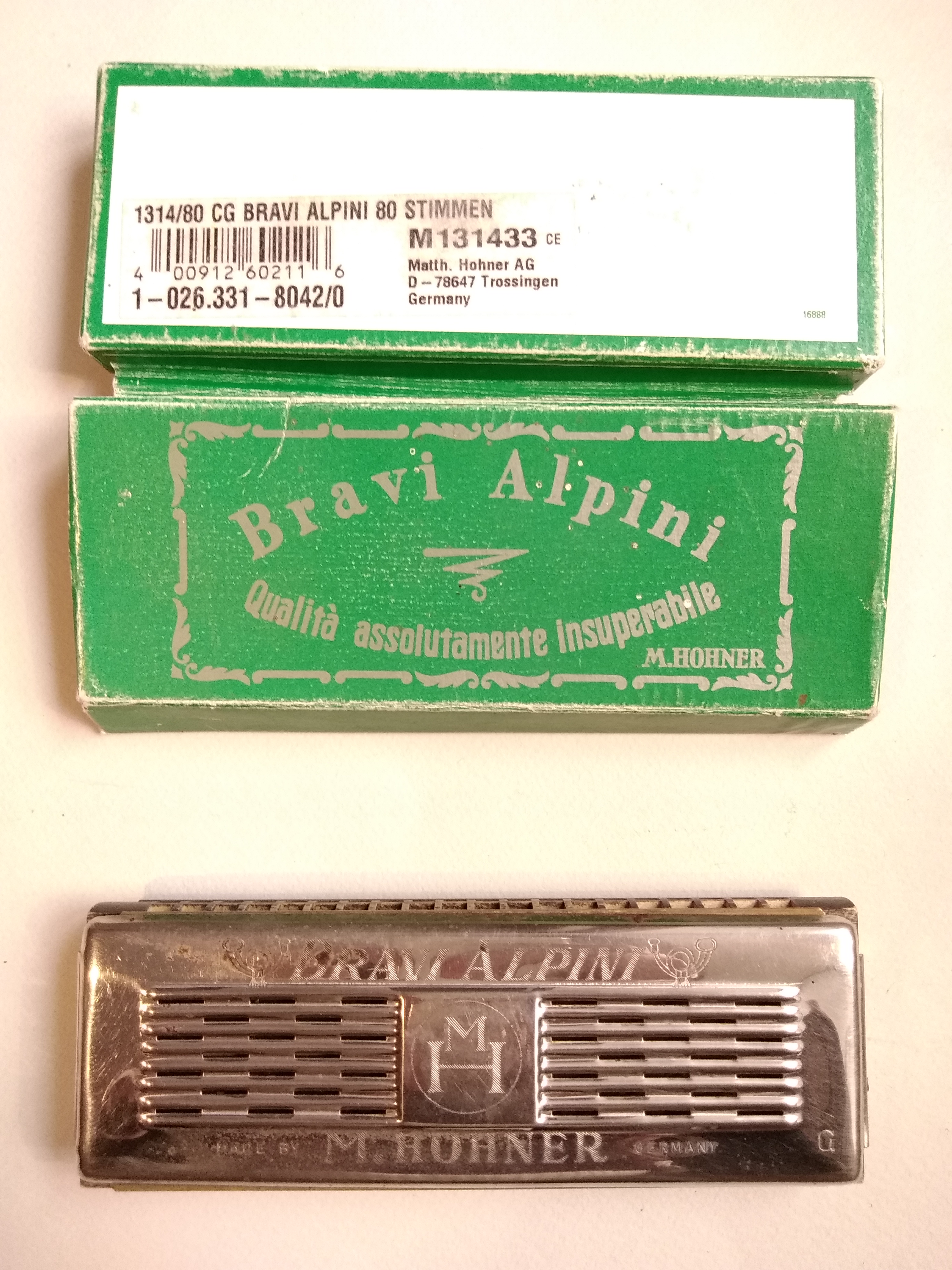 Armonica Modello "Bravi Alpini", diatonica, voci in 2ª. Due tonalità. Strumento costituito da tre elementi: corpo centrale costruito in legno, racchiuso da placchette in acciaio poggiano su un corpo in legno. Presenta 16 doppi fori alle due imboccature, poste su entrambi i lati. Doppio castello, soniere in legno. Placche di chiusura in acciaio, con iscrizione del nome della ditta ed elementi decorativi, che funge da cassa di risonanza con aperture di piccole fessure rettangolari