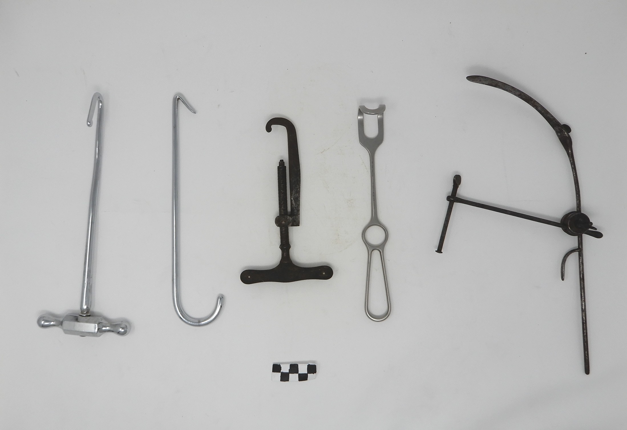 Da sinistra a destra: Decollatore di Braun; Uncino di Smeille; Litotritore di Earle; Valva; Pelvimetro di Van Heuvel a due bracci