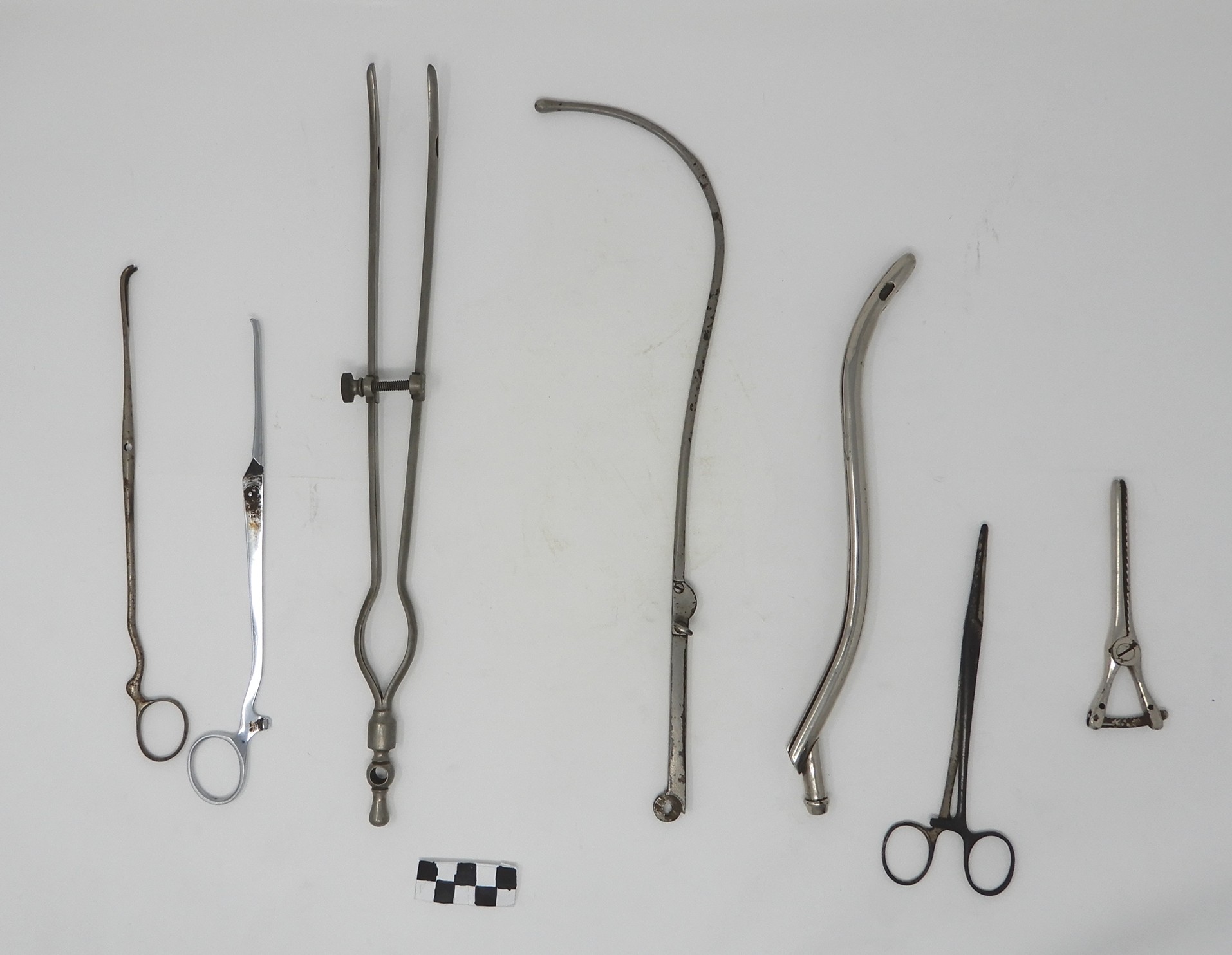 Da sinistra a destra: Parti di pinze in numero di 2; Sonda dilatatrice uterina di Doléris;Pezzo di Pelvimetro; Catetere uretrale; Forcipe emostatico; Pinza ombelicale
