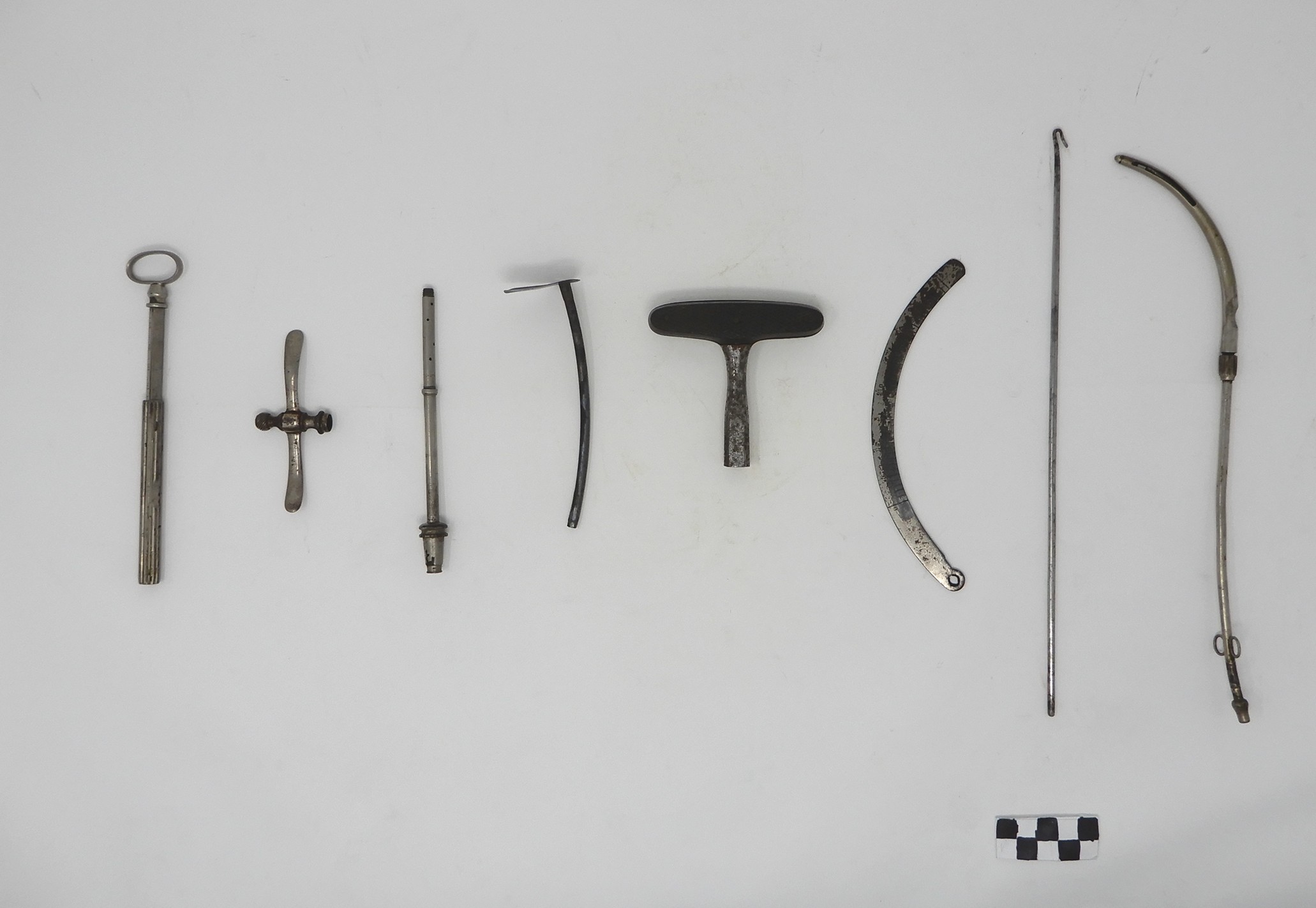 Da sinistra a destra: Strumenti di connessione parziali non identificabili in numero di 5; Parte di Pelvimetro; Uncino/sonda; Catetere uretrale