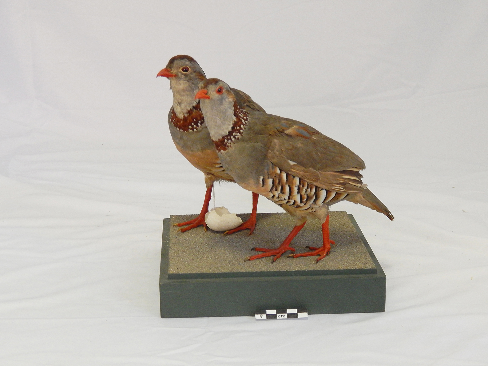 : Coppia di esemplari di pernice sarda tassidermizzati, montati su base, con inserimento di un uovo frammentato |