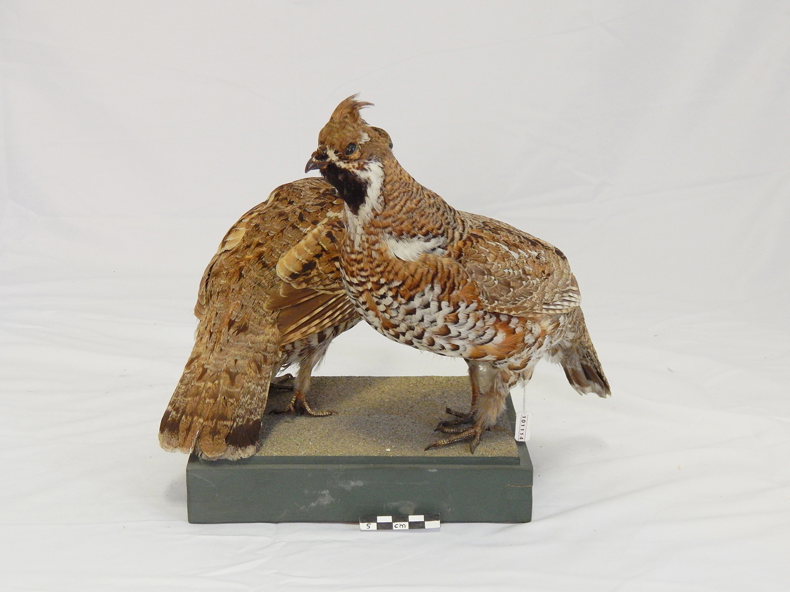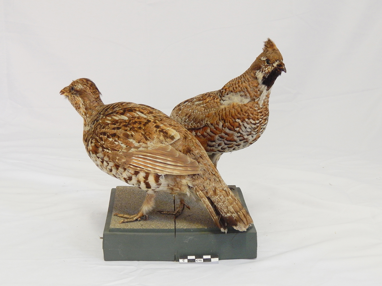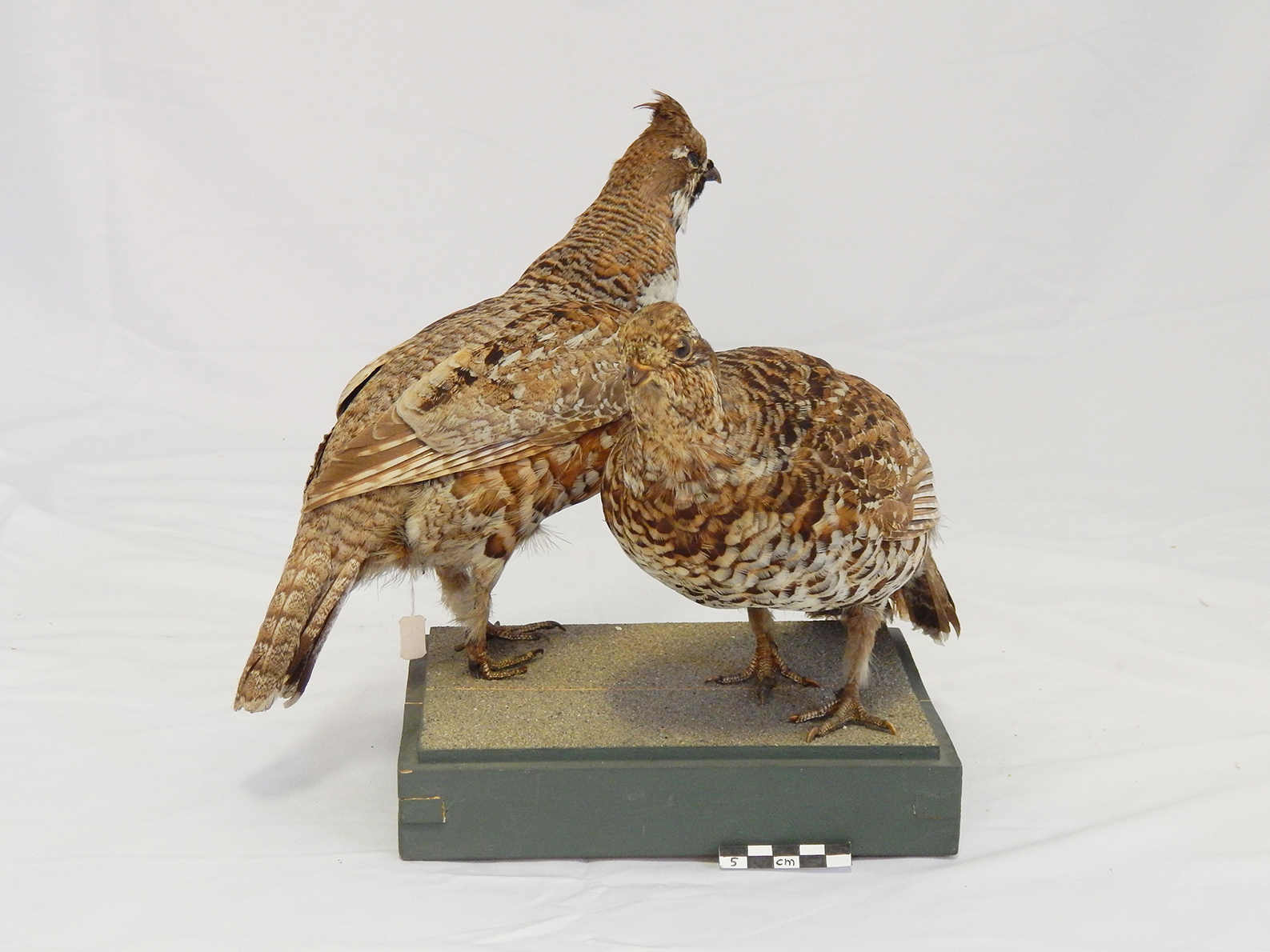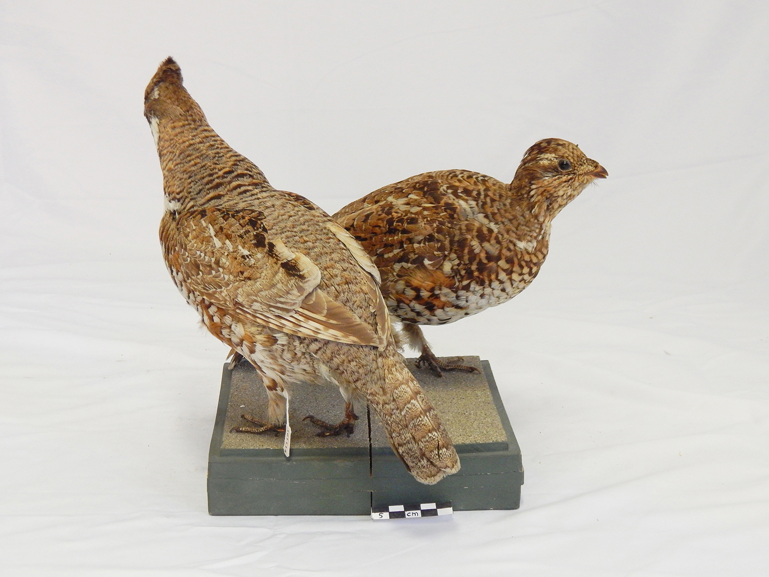 : Due esemplari di francolino di monte tassidermizzati, montati su base |