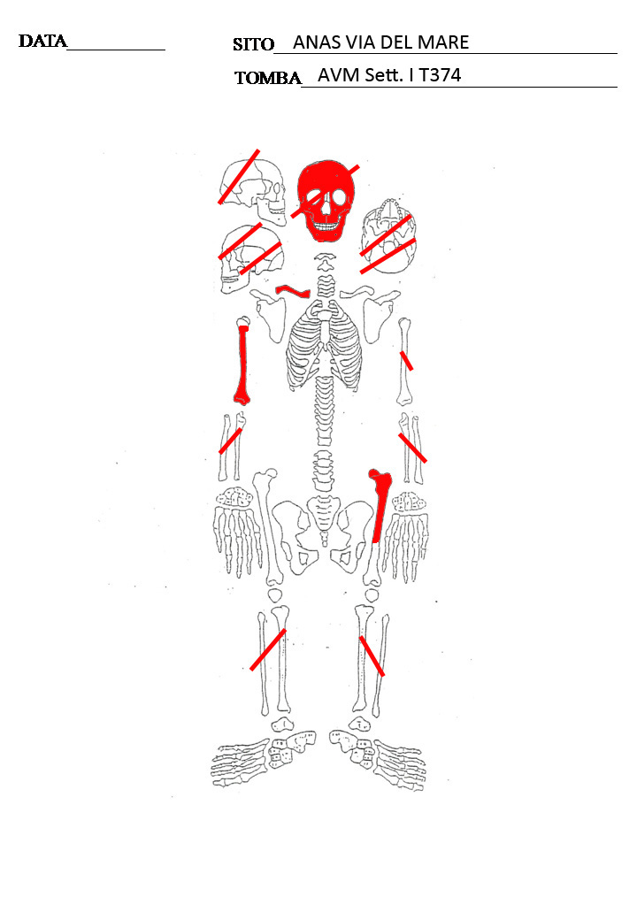 AVM sett.I T.374 Resti scheletrici pertinenti un individuo adulto. Scheletro con uno scarso grado di rappresentatività e conservazione
