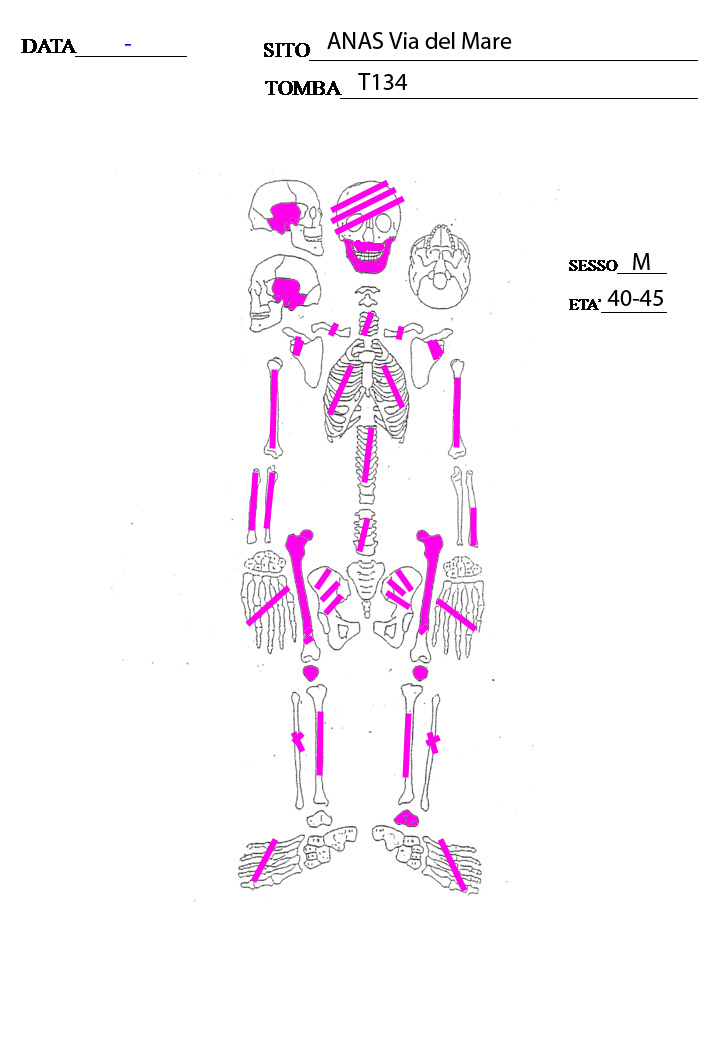 Anas Via del Mare AVM T. 134 Individuo adulto in corso di studio. Lo scheletro è in discreto stato di conservazione e di rappresentazione. Il cranio è frammentato, la mandibola e la mascella sono complete di denti. Dal punto di vista dello stato di salute si osservano a livello del cavo orale: lieve tartaro, perdita di denti intravitam, retrazione ossea; a livello dello scheletro: segni di trauma, osteoartrite, periostite; lievi cribra. Presenti più caratteri discontinui dello scheletro. Frammenti di coccio e ferro in cassetta