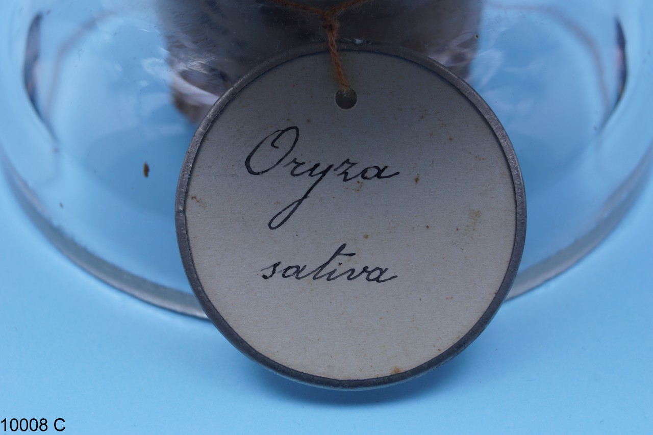 - NOTIZIE STORICO CRITICHE Barattolo in vetro con tappo in sughero contenente cariossidi di Oryza sativa L. La specie è stata pubblicata da: Carl Linnaeus, in: Species Plantarum, 1: 333. 1753. Il nome comune della specie è riso. Il barattolo, insieme ad altri beni botanici, costituiva il Gabinetto di Fisica e di Storia Naturale del Seminario Regionale "Pianum" Abruzzo e Molise
