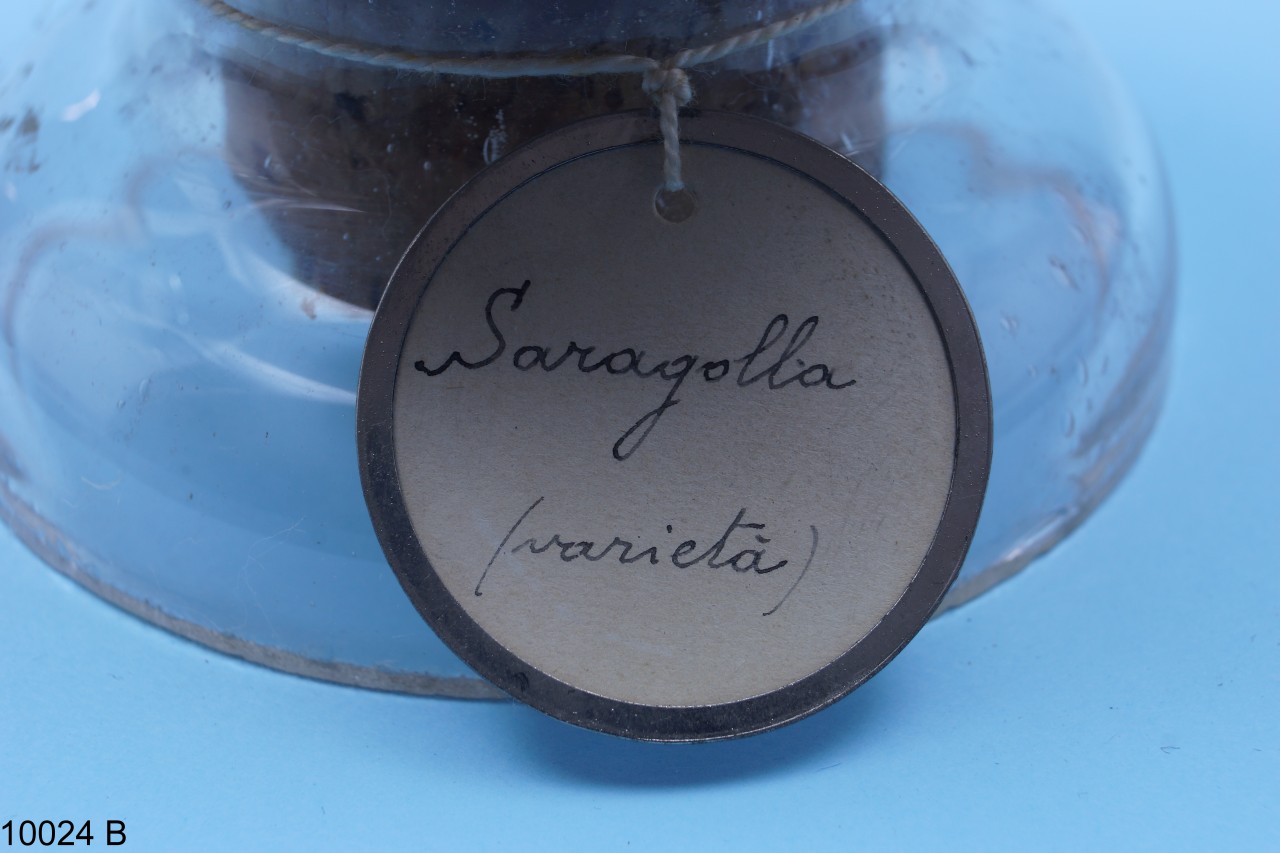 - NOTIZIE STORICO CRITICHE Barattolo in vetro con tappo in sughero contenente cariossidi di Triticum durum Desf. var. Saragolla. La specie è stata pubblicata da: René Louiche Desfontaines, in: Flora Atlantica, 1: 114. 1798. Il nome comune della specie è grano duro varietà Saragolla. Il barattolo, insieme ad altri beni botanici, costituiva il Gabinetto di Fisica e di Storia Naturale del Seminario Regionale "Pianum" Abruzzo e Molise
