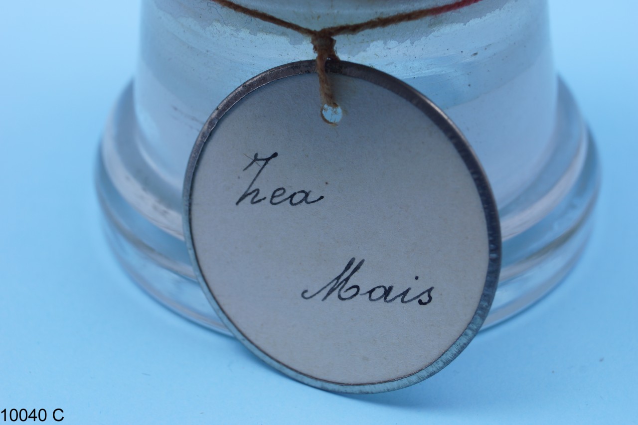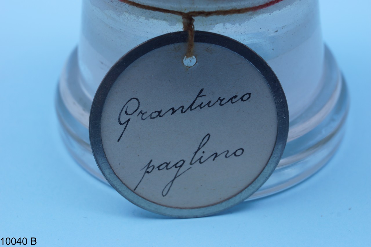 - NOTIZIE STORICO CRITICHE Barattolo in vetro con tappo in sughero contenente cariossidi di Zea mays L. La specie è stata pubblicata da: Carl Linnaeus, in: Species Plantarum, 2: 971. 1753. I nomi comuni della specie sono granoturco, granturco o mais. Il barattolo, insieme ad altri beni botanici, costituiva il Gabinetto di Fisica e di Storia Naturale del Seminario Regionale "Pianum" Abruzzo e Molise