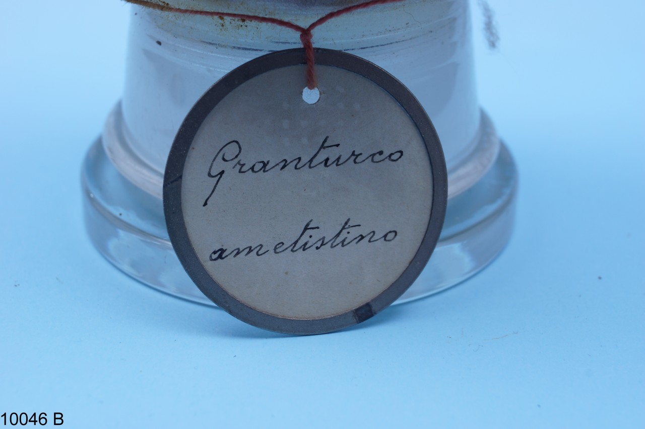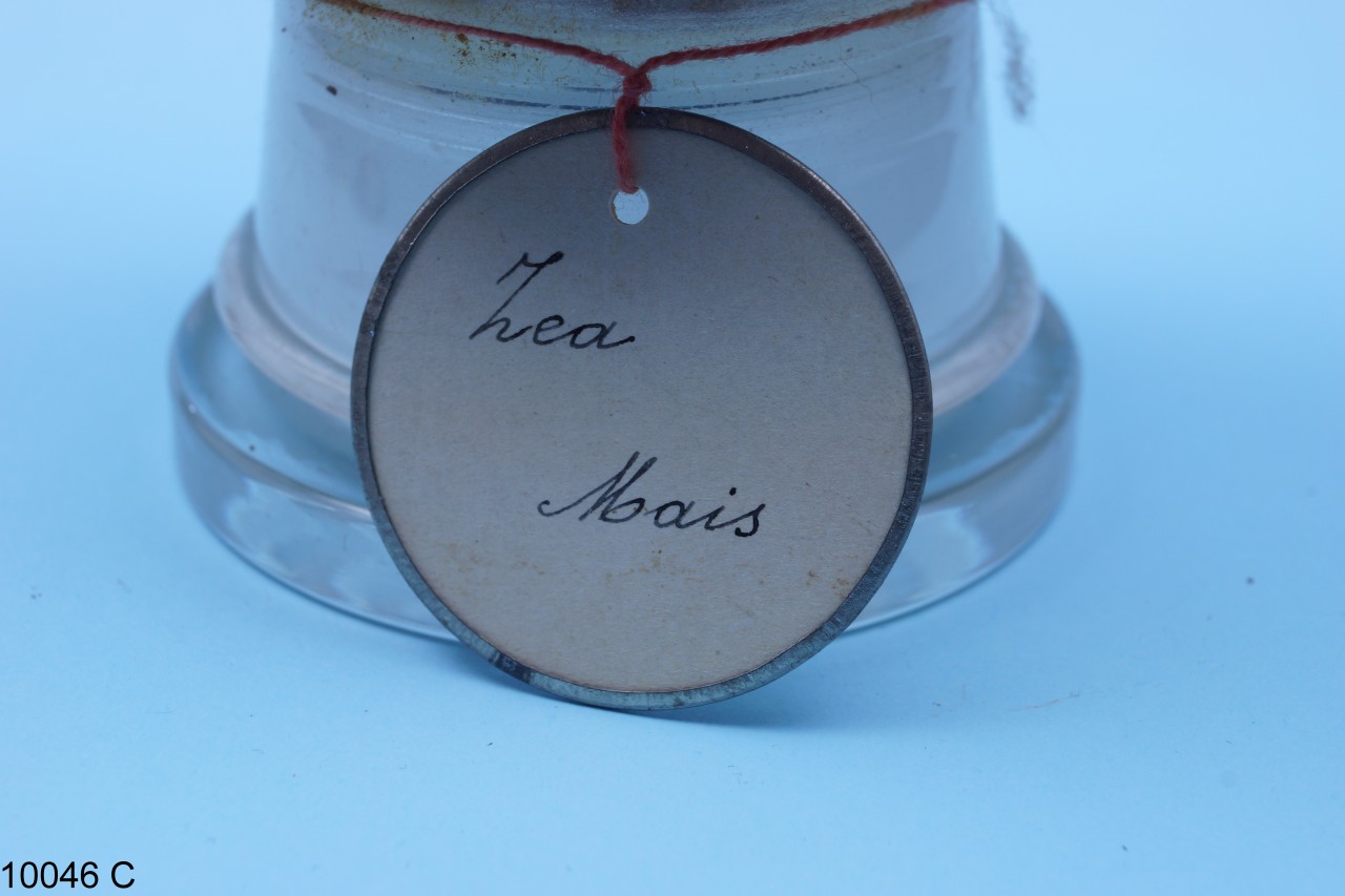 - NOTIZIE STORICO CRITICHE Barattolo in vetro con tappo in sughero contenente cariossidi di Zea mays L. La specie è stata pubblicata da: Carl Linnaeus, in: Species Plantarum, 2: 971. 1753. I nomi comuni della specie sono granoturco, granturco o mais. Il barattolo, insieme ad altri beni botanici, costituiva il Gabinetto di Fisica e di Storia Naturale del Seminario Regionale "Pianum" Abruzzo e Molise