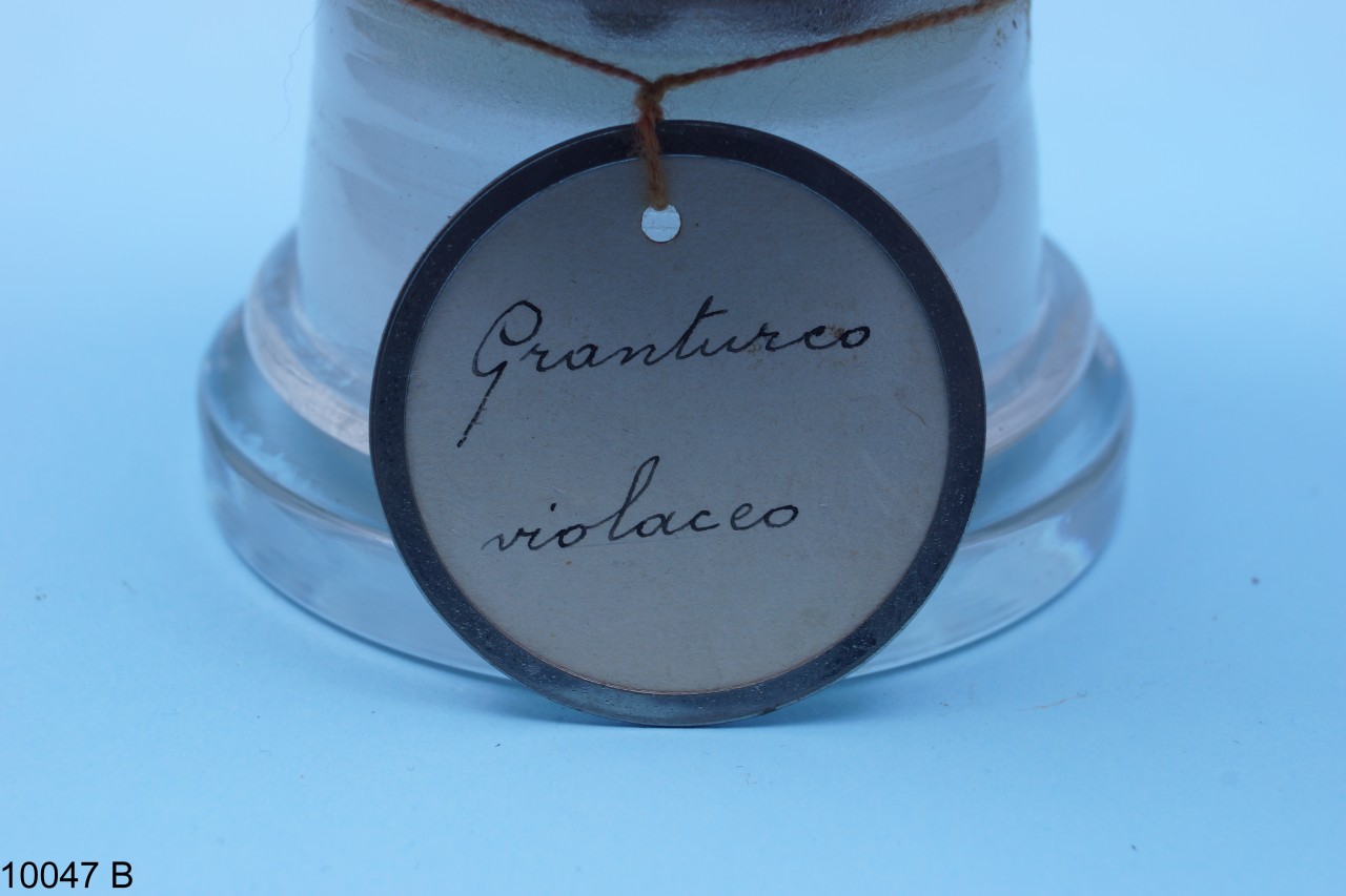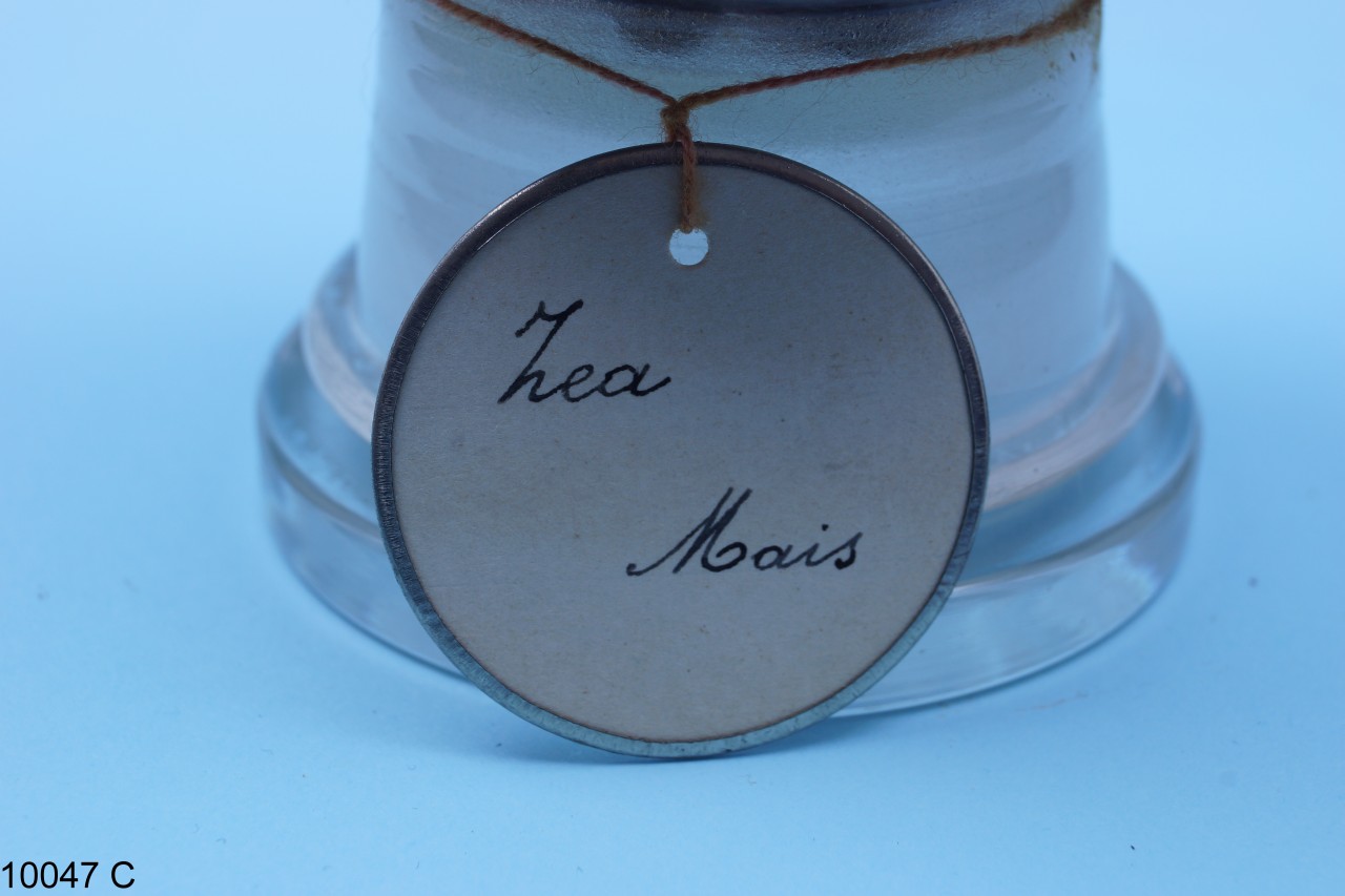 - NOTIZIE STORICO CRITICHE Barattolo in vetro con tappo in sughero contenente cariossidi di Zea mays L. La specie è stata pubblicata da: Carl Linnaeus, in: Species Plantarum, 2: 971. 1753. I nomi comuni della specie sono granoturco, granturco o mais. Il barattolo, insieme ad altri beni botanici, costituiva il Gabinetto di Fisica e di Storia Naturale del Seminario Regionale "Pianum" Abruzzo e Molise