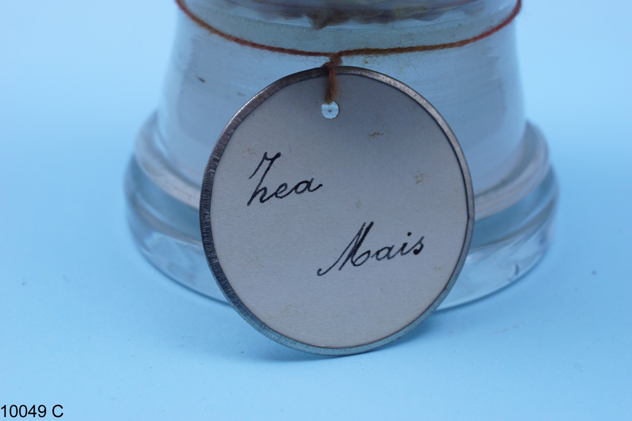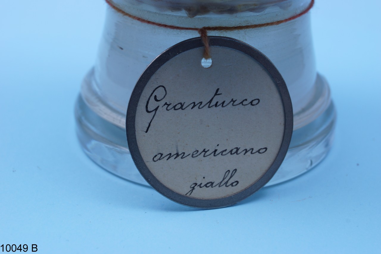 - NOTIZIE STORICO CRITICHE Barattolo in vetro con tappo in sughero contenente cariossidi di Zea mays L. La specie è stata pubblicata da: Carl Linnaeus, in: Species Plantarum, 2: 971. 1753. I nomi comuni della specie sono granoturco, granturco o mais. Il barattolo, insieme ad altri beni botanici, costituiva il Gabinetto di Fisica e di Storia Naturale del Seminario Regionale "Pianum" Abruzzo e Molise