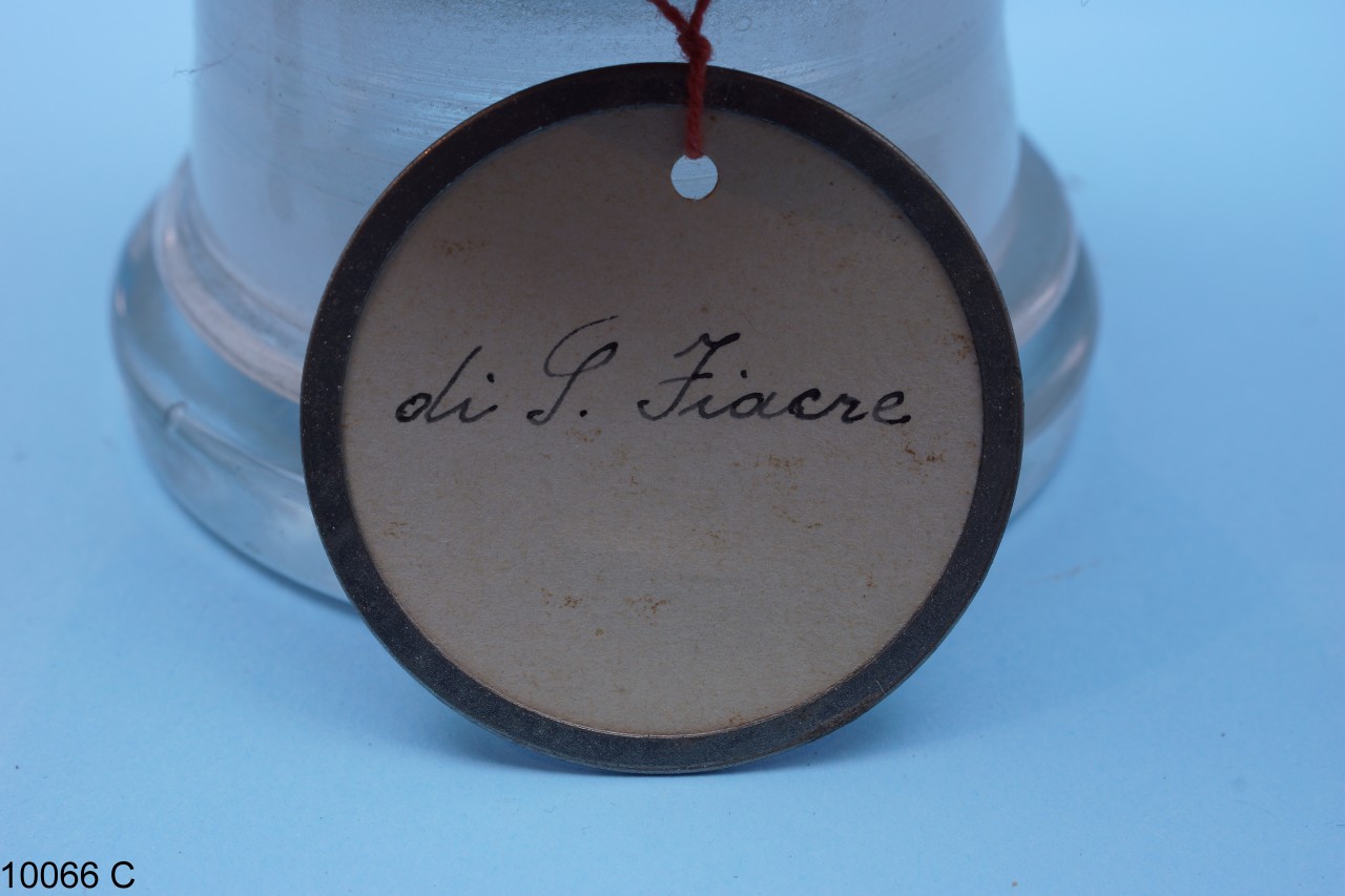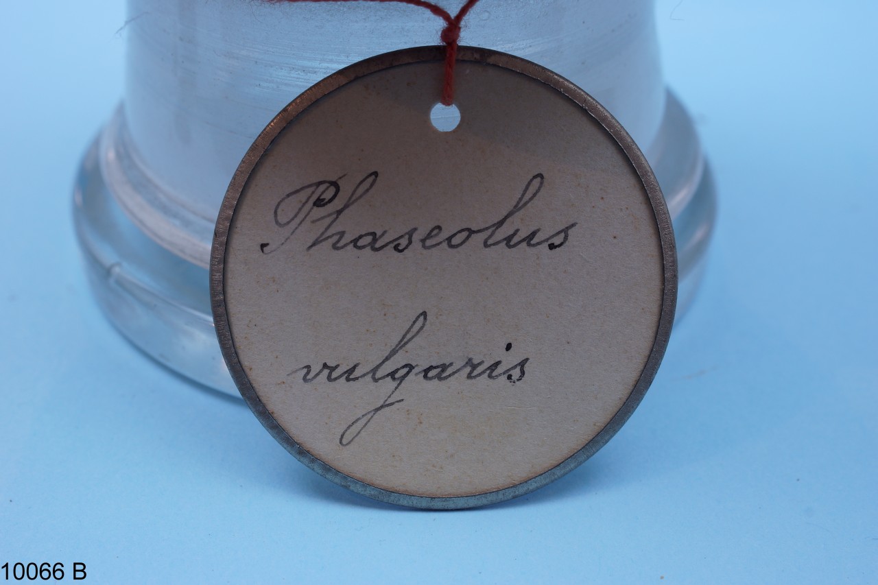 - NOTIZIE STORICO CRITICHE Barattolo in vetro con tappo in sughero contenente semi di Phaseolus vulgaris L. La specie è stata pubblicata da: Carl Linnaeus, in: Species Plantarum, 2: 723. 1753. Il nome comune della specie è fagiolo. Il barattolo, insieme ad altri beni botanici, costituiva il Gabinetto di Fisica e di Storia Naturale del Seminario Regionale "Pianum" Abruzzo e Molise