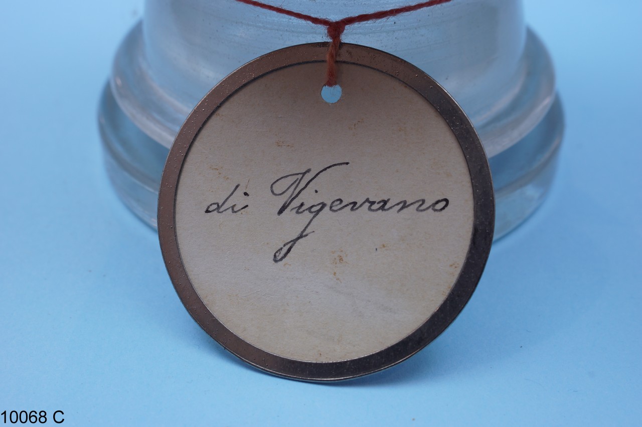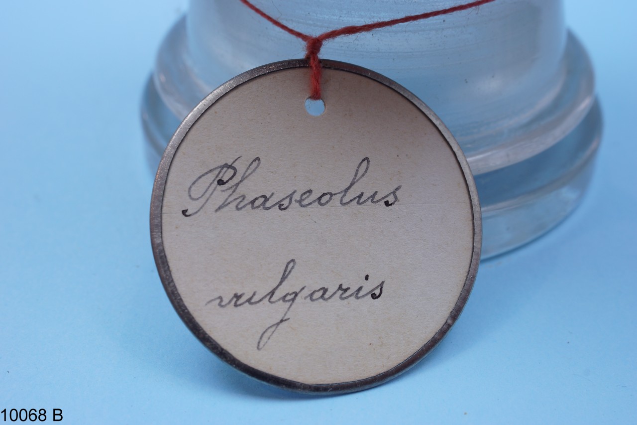 - NOTIZIE STORICO CRITICHE Barattolo in vetro con tappo in sughero contenente semi di Phaseolus vulgaris L. La specie è stata pubblicata da: Carl Linnaeus, in: Species Plantarum, 2: 723. 1753. Il nome comune della specie è fagiolo. Il barattolo, insieme ad altri beni botanici, costituiva il Gabinetto di Fisica e di Storia Naturale del Seminario Regionale "Pianum" Abruzzo e Molise
