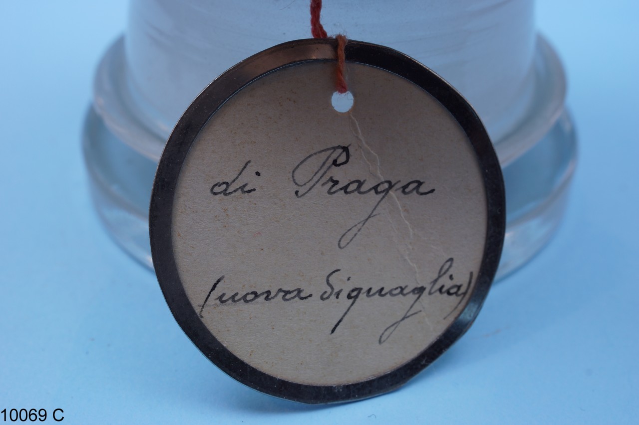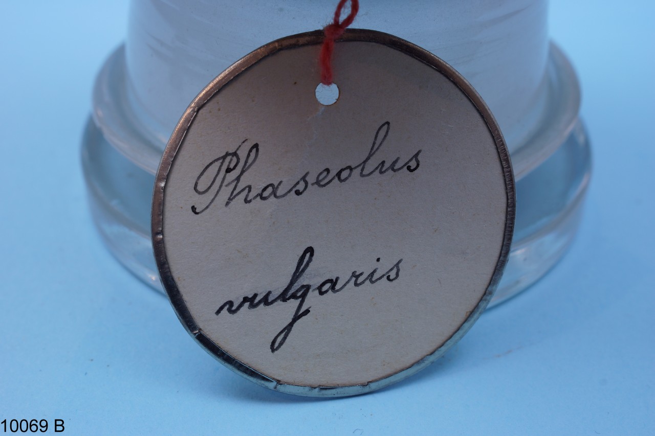 - NOTIZIE STORICO CRITICHE Barattolo in vetro con tappo in sughero contenente semi di Phaseolus vulgaris L. La specie è stata pubblicata da: Carl Linnaeus, in: Species Plantarum, 2: 724. 1753. Il nome comune della specie è fagiolo. Il barattolo, insieme ad altri beni botanici, costituiva il Gabinetto di Fisica e di Storia Naturale del Seminario Regionale "Pianum" Abruzzo e Molise