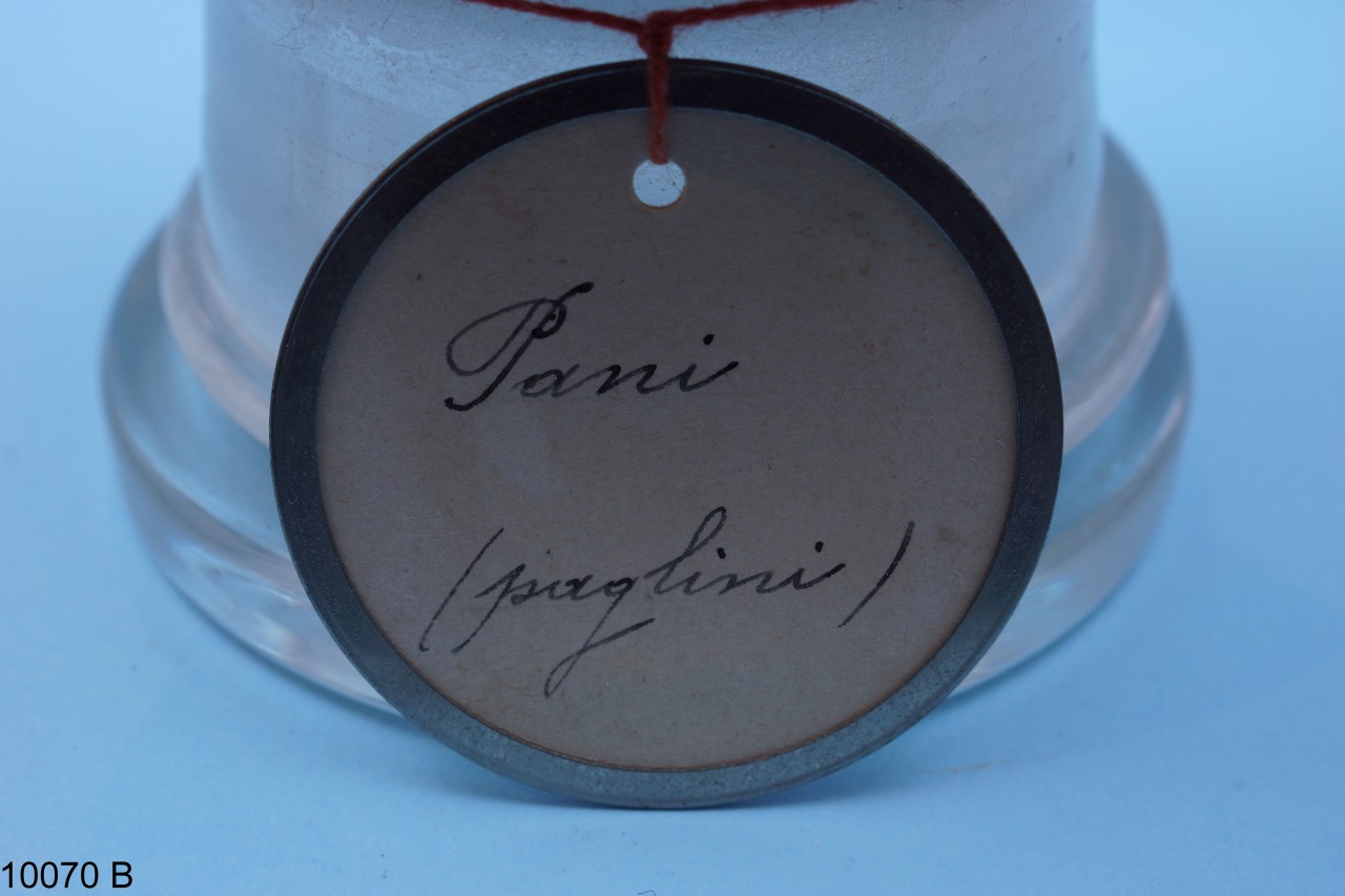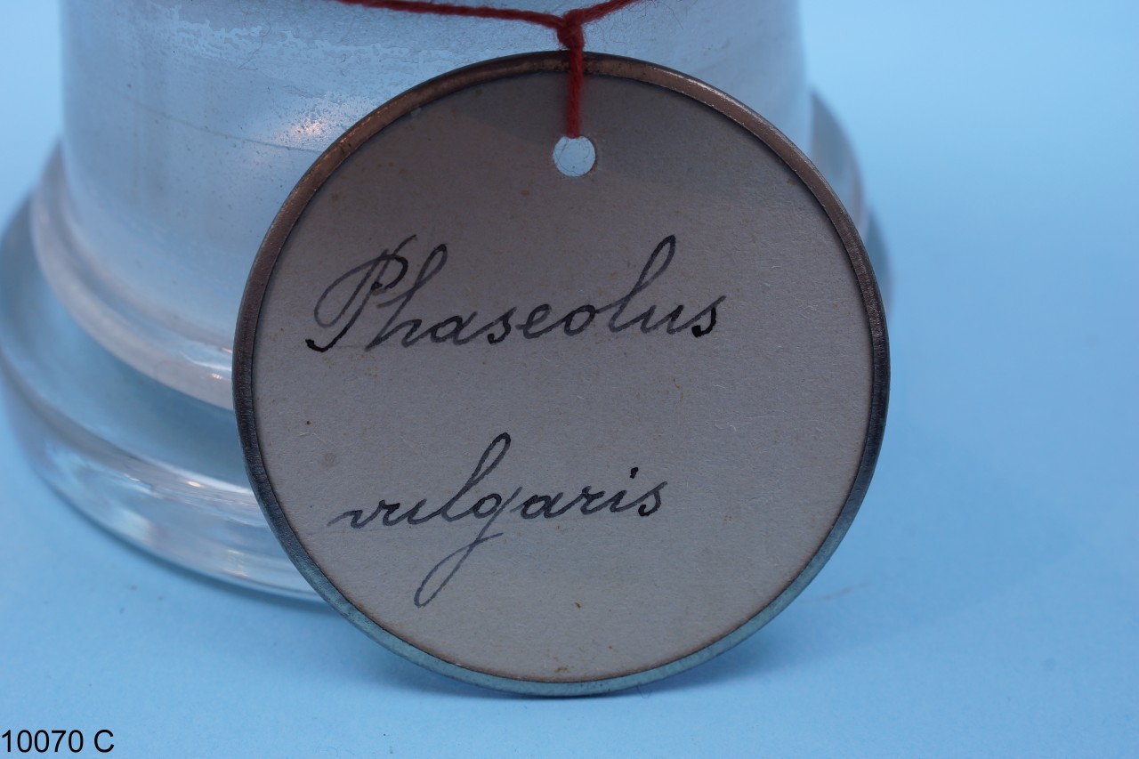 - NOTIZIE STORICO CRITICHE Barattolo in vetro con tappo in sughero contenente semi di Phaseolus vulgaris L. La specie è stata pubblicata da: Carl Linnaeus, in: Species Plantarum, II: 723. 1753. Il nome comune della specie è fagiolo. Il barattolo, insieme ad altri beni botanici, costituiva il Gabinetto di Fisica e di Storia Naturale del Seminario Regionale "Pianum" Abruzzo e Molise