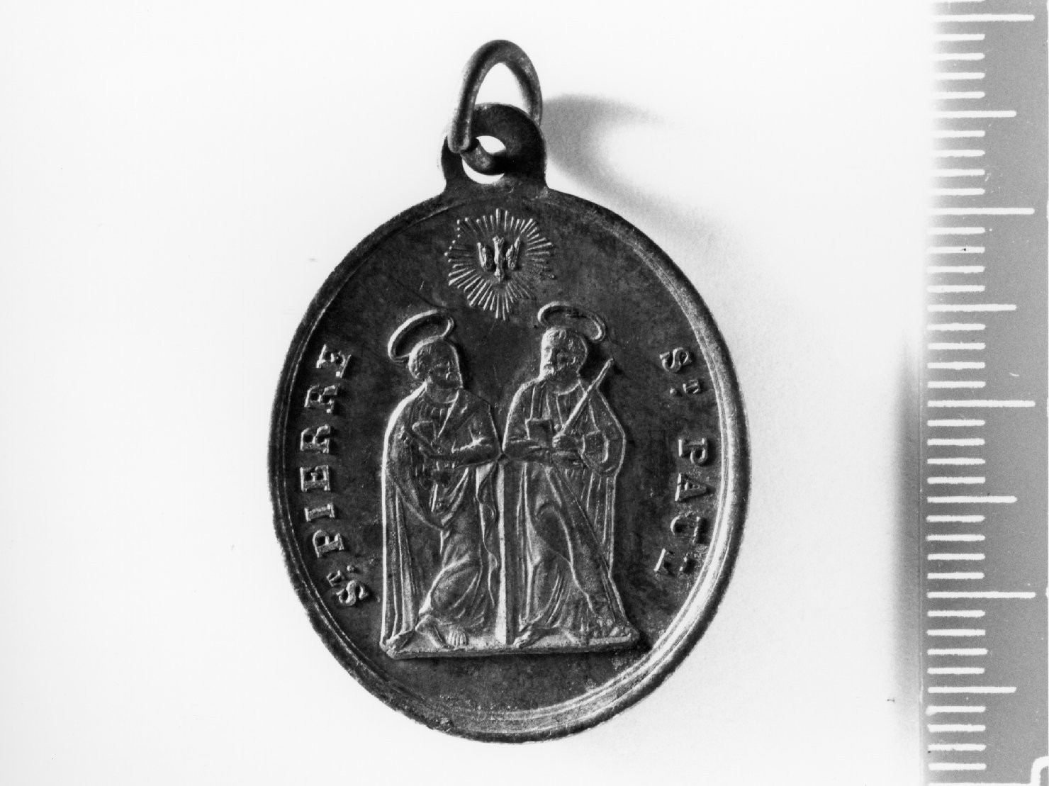 Dritto: Busto di Pio IX con berretta, mozzetta e stola a s.; medaglia ovale; con appiccagnolo e anellino. Rovescio: A s. San Pietro stringe tra le mani un libro e le chiavi, a d. San Paolo stringe un libro e la spada; in alto la colomba dello Spirito Santo