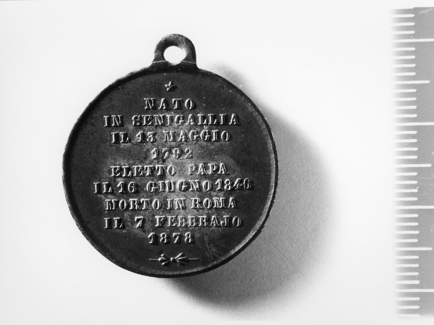 Dritto: Busto di Pio IX con berretta, mozzetta e stola a s.; con appiccagnolo. Rovescio: Legenda