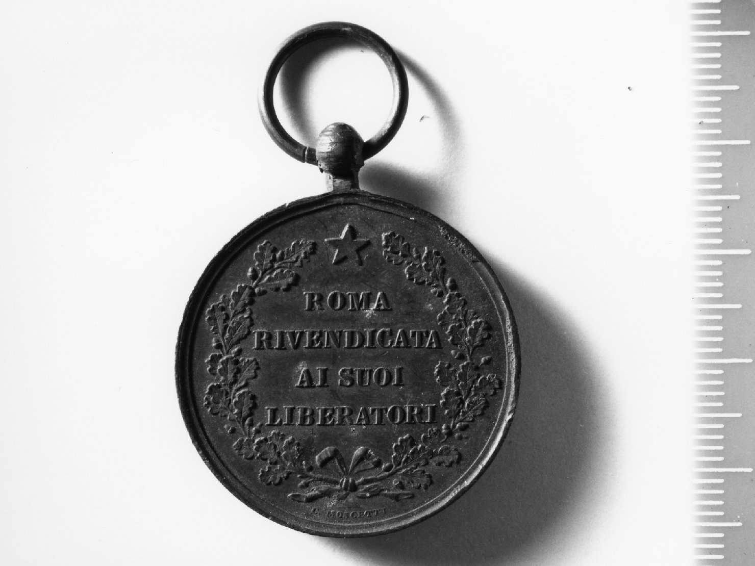 Dritto: Scudo civico di Roma sormontato dalla Lupa che allatta Remo e Romolo e poggiante su due fasci littori incrociati, attorniati da rami di quercia. Rovescio: Entro corona di quercia con nastro e stella in alto, legenda