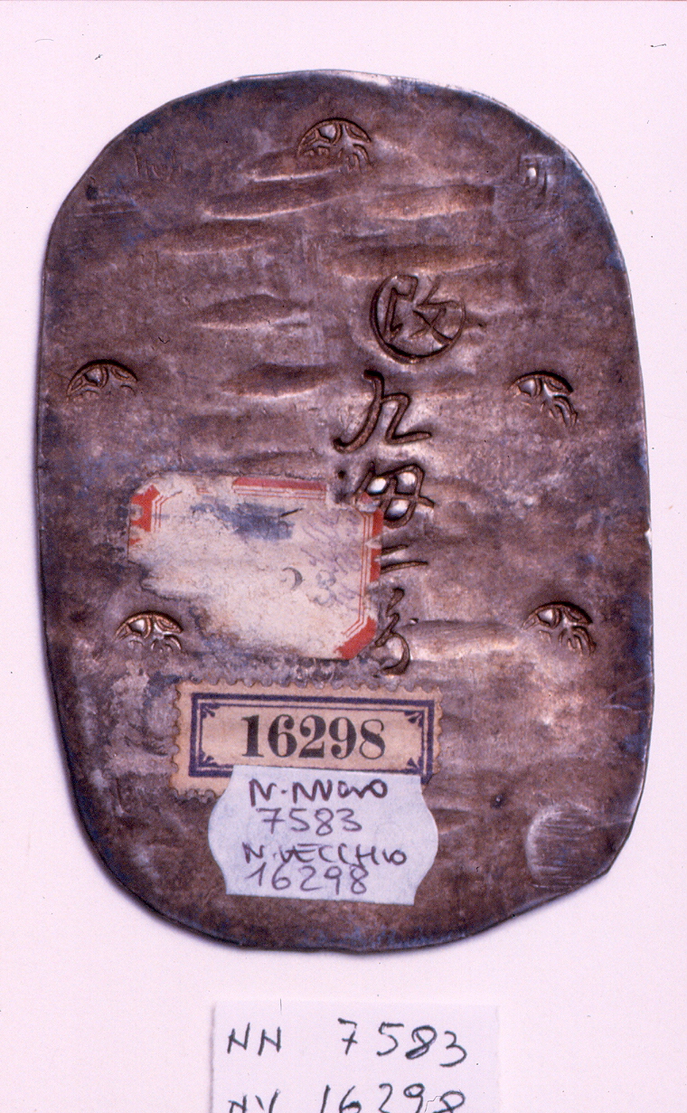 Dritto: Sottile moneta "oban" con punzoni dello zecchiere e della famiglia imperiale. Rovescio:
