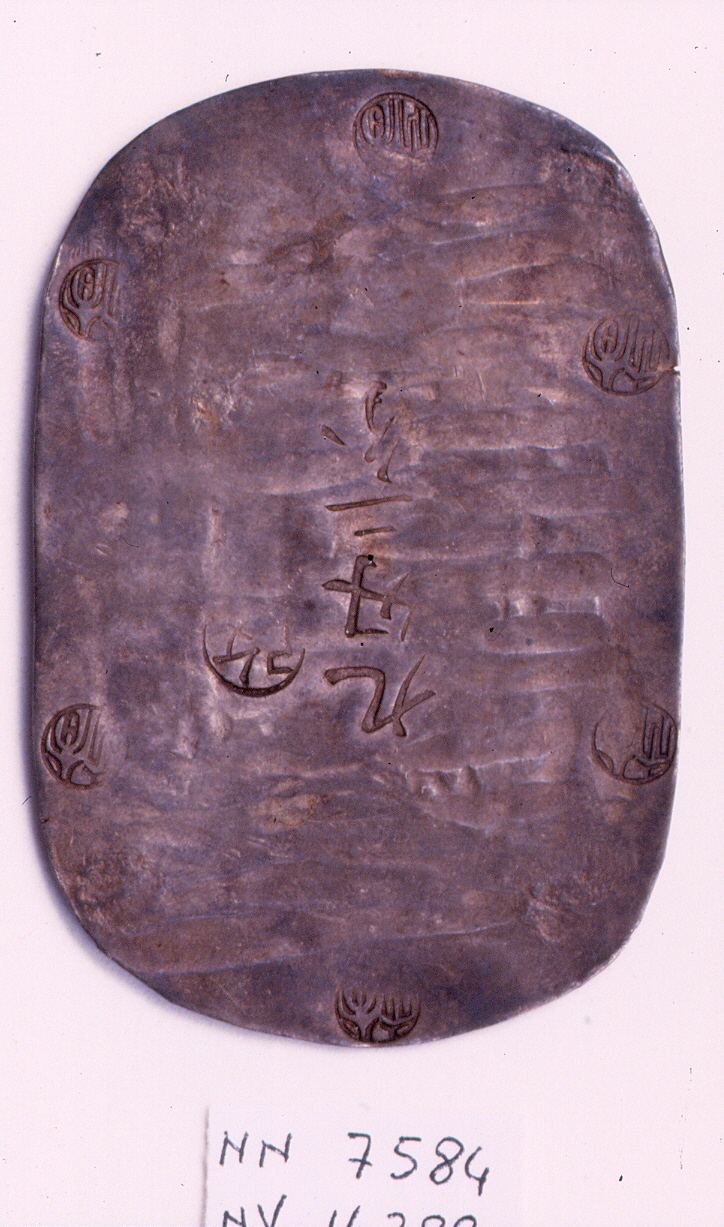 Dritto: Sottile moneta "oban" con punzoni dello zecchiere e della famiglia imperiale. Rovescio: