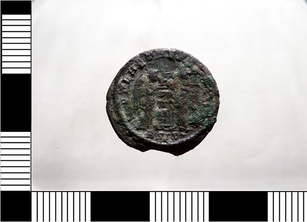 Dritto: Busto elmato e corazzato di Costantino I a s., con lancia appoggiata alla spalla d. e scudo sulla spalla s., bordo perlinato. Rovescio: Due Vittorie affrontate sorreggono tra di loro una corona, recante una legenda, sopra un altare, bordo perlinato