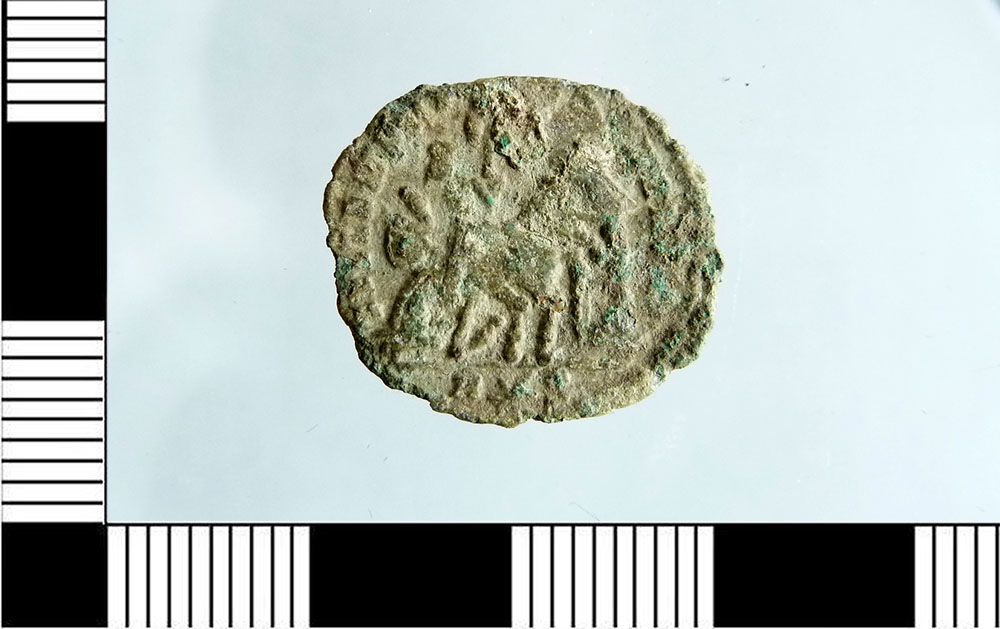 Dritto: Busto drappeggiato e corazzato di Costanzo Gallo a d., bordo perlinato. Rovescio: Soldato stante a s. abbatte un cavaliere, con copricapo a punta, che ricade sul collo del cavallo; a terra a d., uno scudo, bordo perlinato