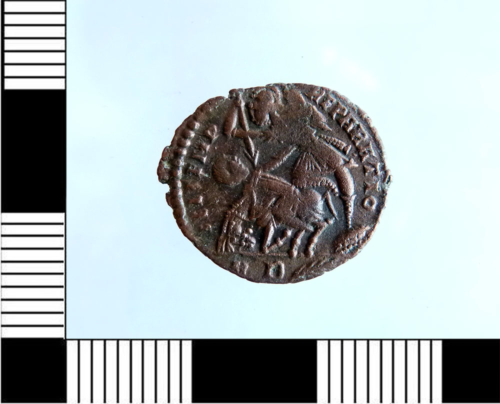Dritto: Busto diademato, drappeggiato e corazzato di Costanzo II a d., bordo perlinato. Rovescio: Soldato stante a s. abbatte un cavaliere, senza copricapo, che cadendo da cavallo solleva il braccio s.; a terra a d., uno scudo, bordo perlinato
