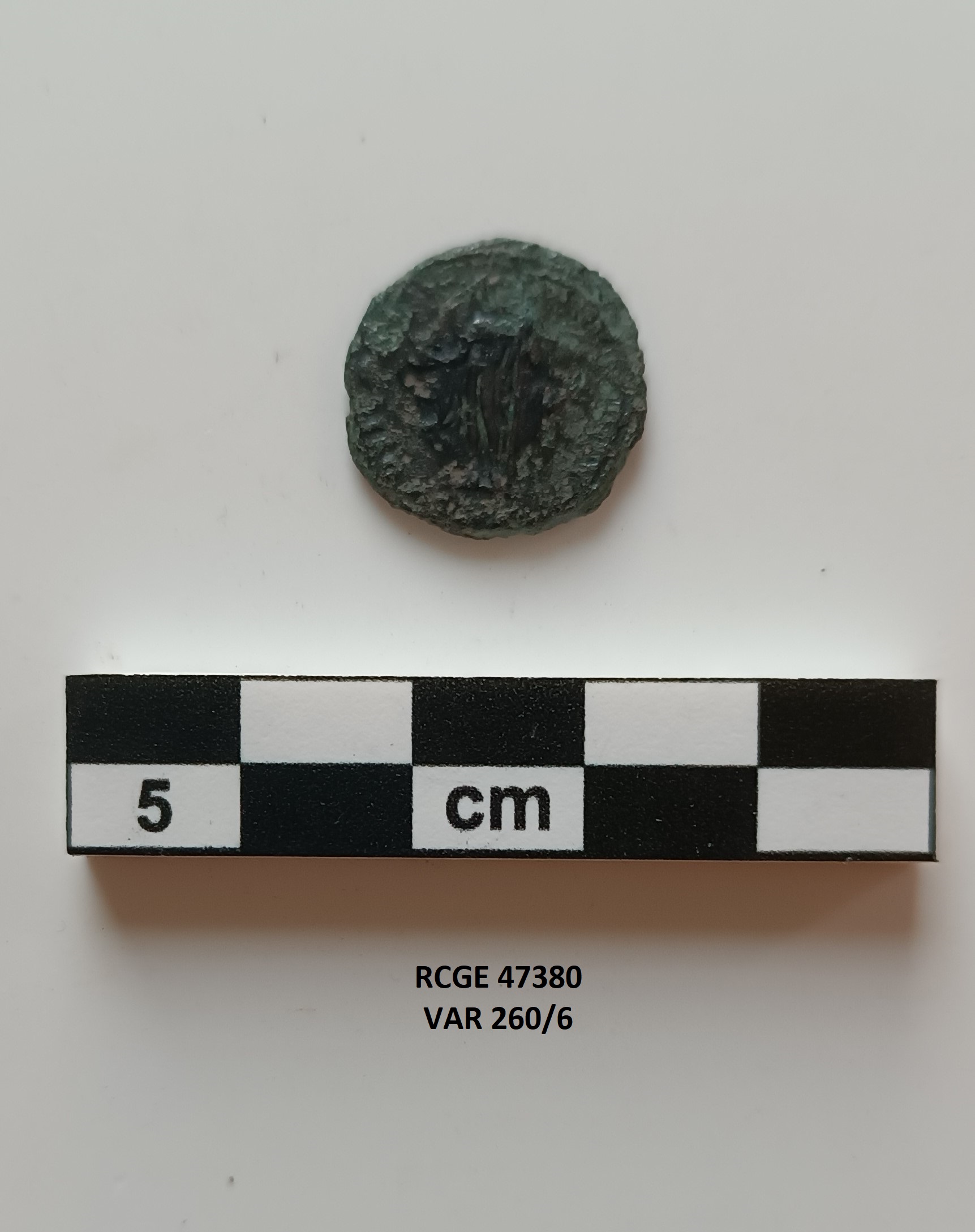 Dritto: busto laureato e paludato a sinistra, con mappa nella destra e scettro nella sinistra. Rovescio: nel campo, a sinistra corona; a destra (A?); in esergo (SMK)? Giove nudo con lembo della clamide pendente dalla spalla sinistra, stante di prospetto con testa a sinistra, ha Vittoria sul globo nella destra e scettro verticale nella sinistra