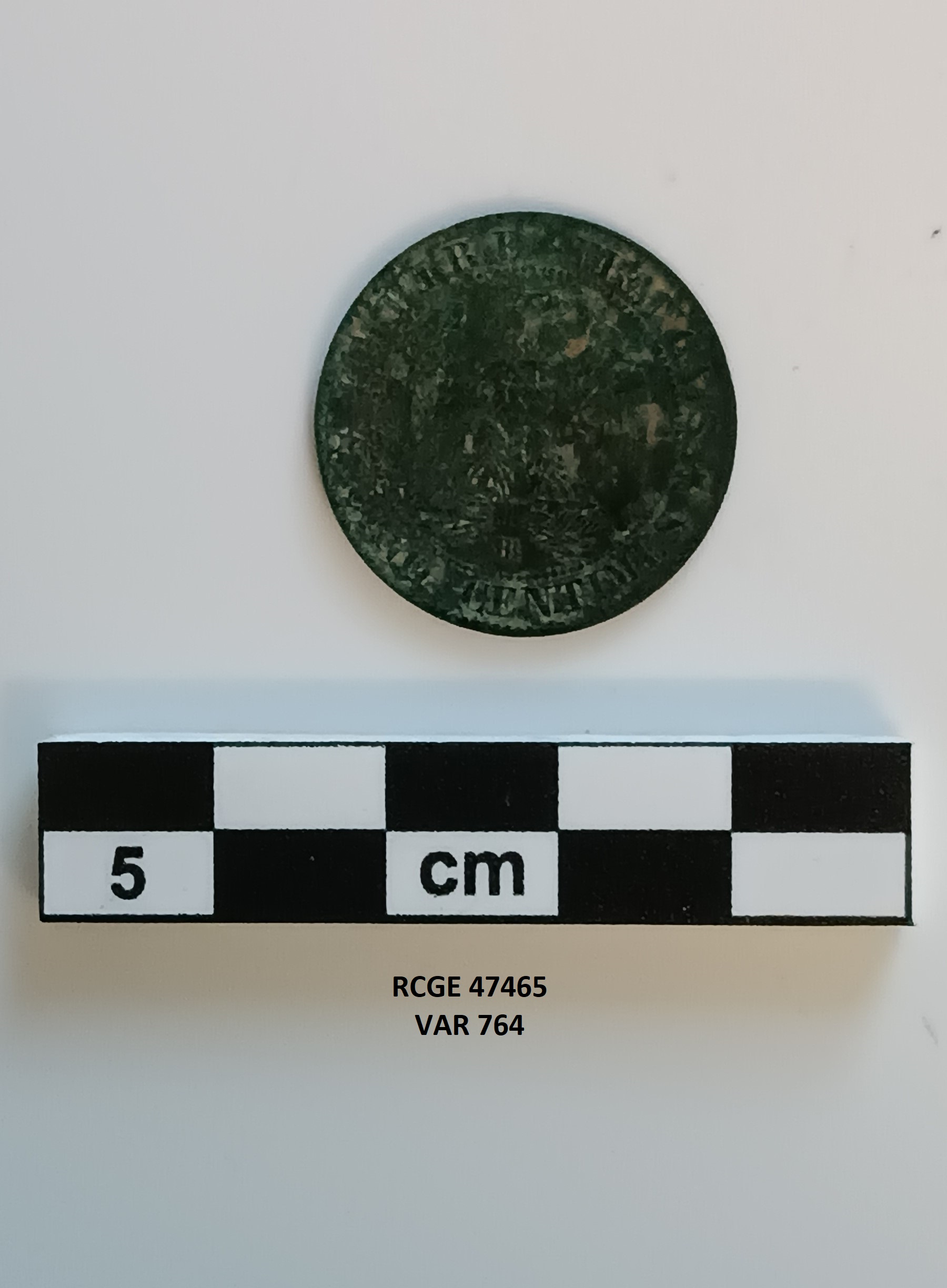 Dritto: Testa laureata a sinistra. Rovescio: Aquila di prospetto con rostro a destra e con fulmine tra gli artigli. Sotto: lettere BB