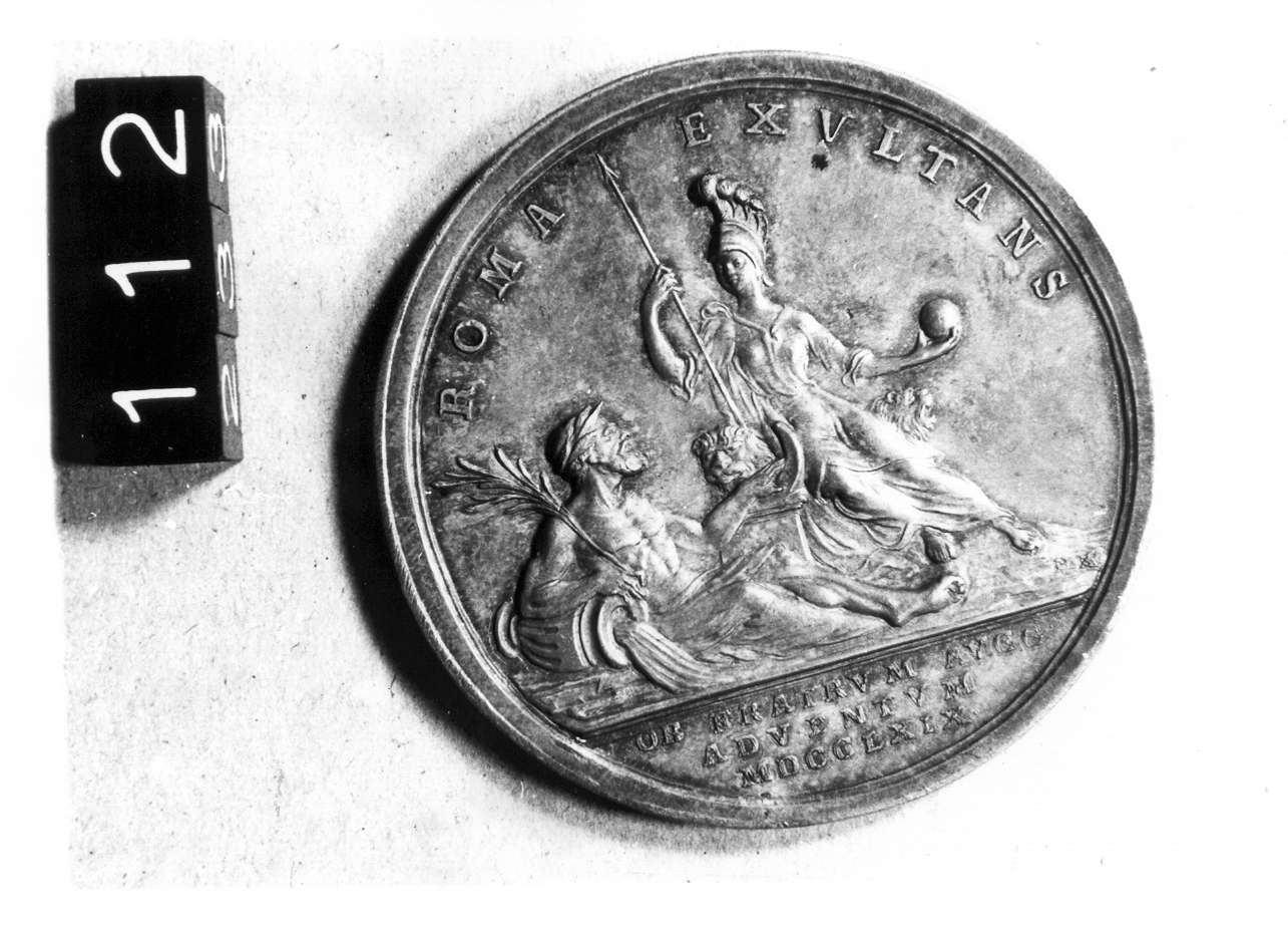 Dritto: Busti affrontati dei due fratelli; l'Imperatore laureato, armato all'antica col Tonsone d'oro alla corazza e l'ermellino. Il granduca armato e con acconciatura contemporanea, col nastro e il tonsone d'oro e l'ermellino. Rovescio: Figura muliebre allegorica di Roma, seduta tra due leoni con un globo nella mano sinistra e una lancia nella destra. A sinistra, seduto, il Tevere, laureato e appoggiato ad un'urna versante e con un racemo nella mano destra