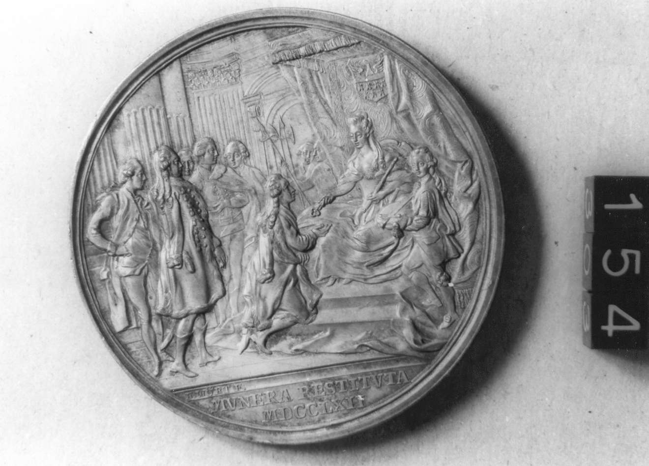 Dritto: Busto di profilo con diadema e filo di perle in capo, capelli trattenuti sul dietro con chioma che scende sulle spalle. Rovescio: M. Teresa seduta sotto un baldacchiono con lo scudo di Travsilvanbia dà la chiave di ciambellano a uno dei Grandi Ufficiali vestiti all'ungherese inginocchiato davanti a lei sotto gli occhi degli altri mentre un paggio sulla destra presenta una spada su un cuscino