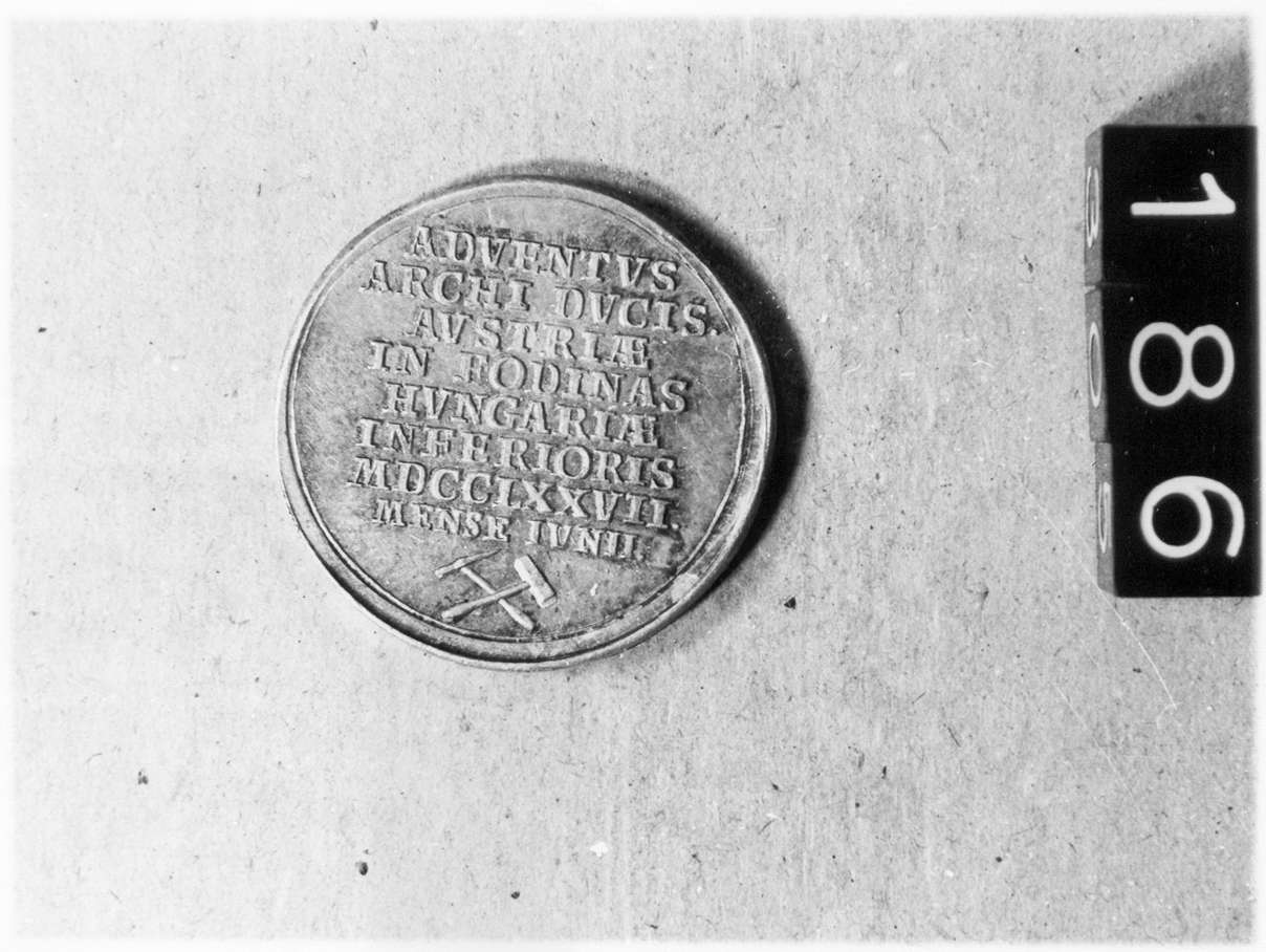Dritto: Busto armato di profilo a destra con nastro e con la croce di Cavaliere dell'Ordine Teutonico; capelli lunghi raccolti con un nastro sulla nuca. Rovescio: Iscrizione in 8 righe (l'ultima con caratteri più piccoli) terminante, in basso, con martello e piccone incrociati