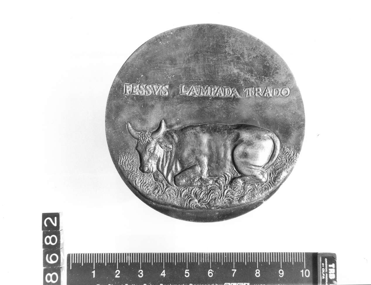 Dritto: Busto di profilo di Marco Mantova Benavides verso destra, i capelli corti e crespi e una sottile barba appuntita sul mento, indossa una tunica accollata. Rovescio: Un grosso toro accovacciato su di un prato erboso