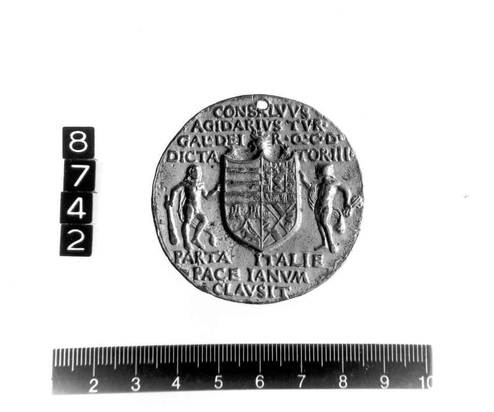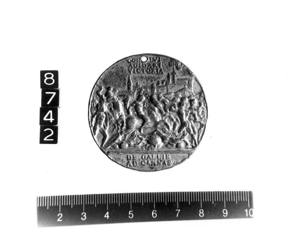 Dritto: Arme inquartata di Consalvo di Cordova y Aguilar retta da aquila e affiancata da Ercole a sinistra e Giano a destra. Rovescio: Battaglia tra Spagnoli e Francesi a Canne
