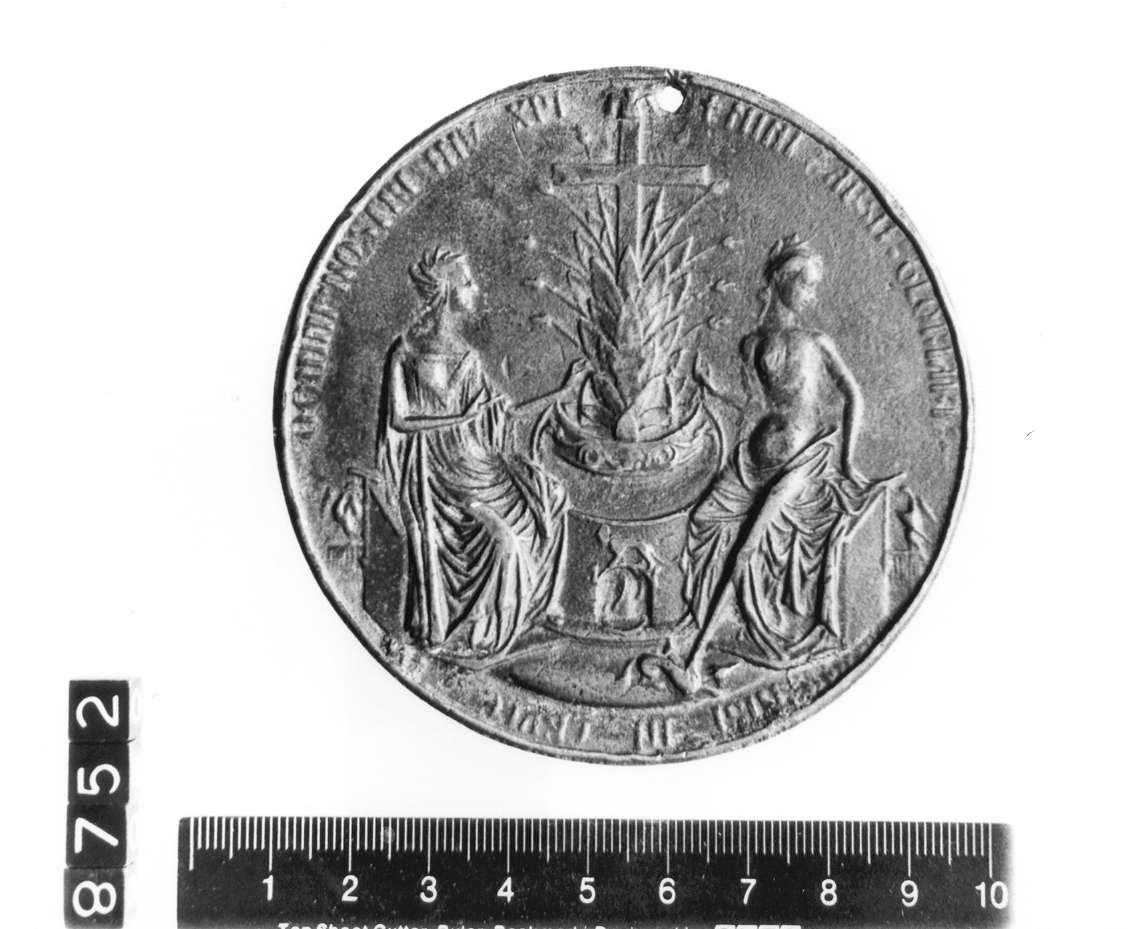 Dritto: L'imperatore coronato e indossante una lunga tunica, su un cavallo riccamente bardato incedente al passo verso destra. Rovescio: Sul campo, al centro, una fontana, costituita da un bacino circolare entro il quale si inserisce un secondo bacino con il bordo decorato da cui si eleva una pianta con larghe foglie e fiori; in mezzo alla quale sporge l'estremità superiore di una croce; ai lati del fonte siedono due figure femminili, una, più anziana, completamente vestita con un'ampia tunica e con il capo coperto, l'altra, più giovane, semipanneggiata, con una sorta di turbante in testa e un panno che le copre (continua in OSS)