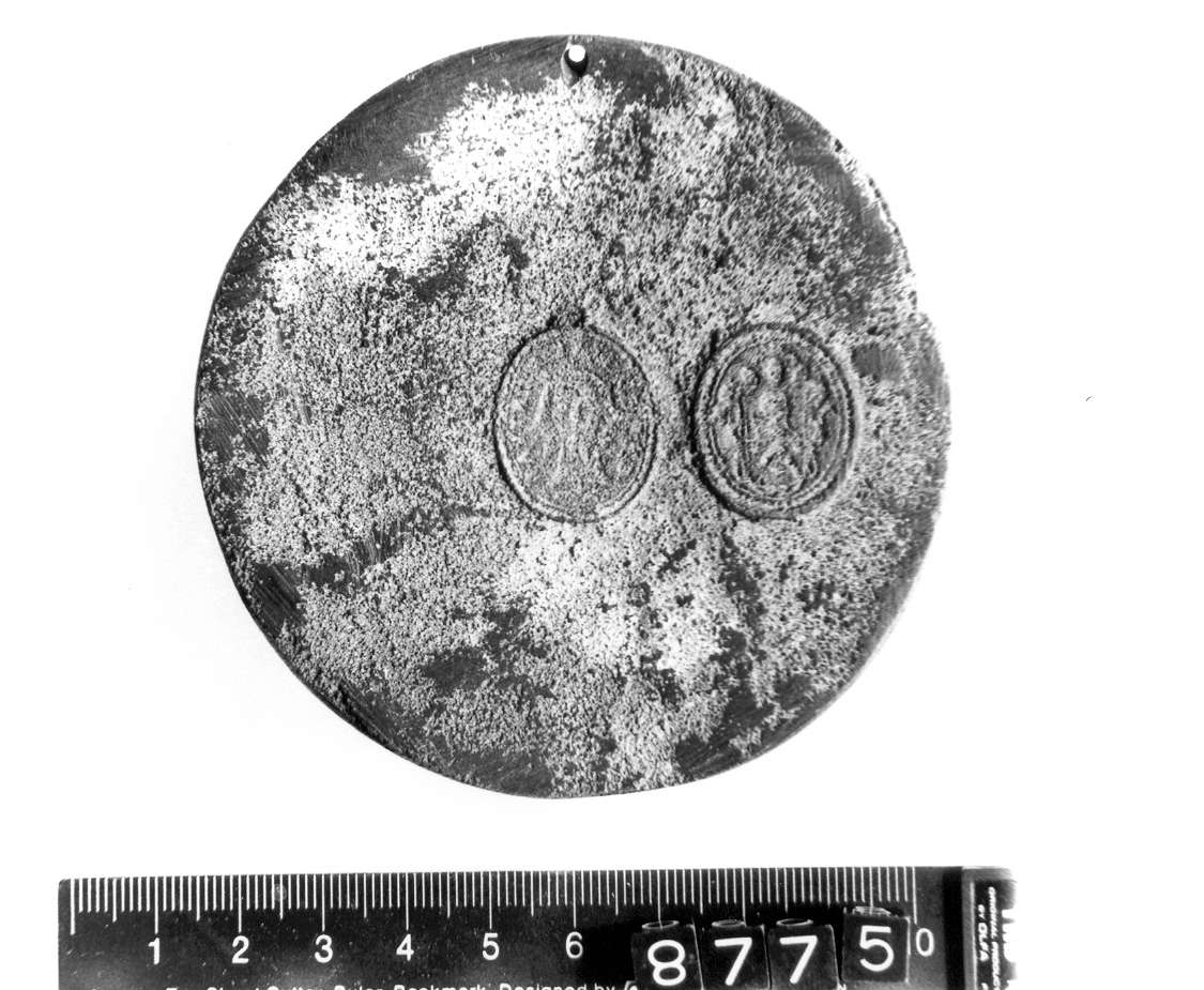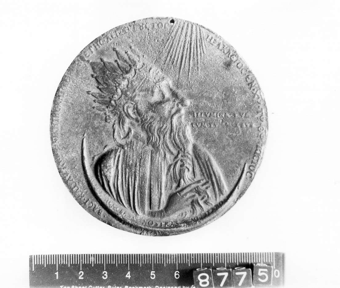 Dritto: Busto di tre quarti dell'Imperatore, con il profilo verso destra, poggiante su una mezza luna; indossa un'elaborata corona e trattiene con entrambe le mani la lunga barba ricadente sul busto; lo sguardo è rivolto verso l'alto, nella direzione dei raggi di luce che si espandono sul campo dal bordo esterno della medaglia. Rovescio: