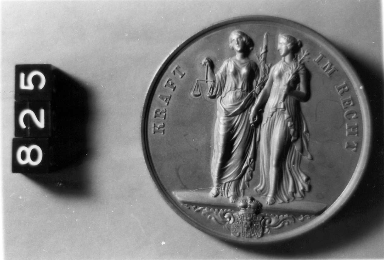 Dritto: Busto a destra, faccia glabra, capelli corti mossi. Rovescio: La Pace e la Giustizia con il motto di Clemens metternich. All'esergo, l'arma tripartita coronata di Metternich tra volute