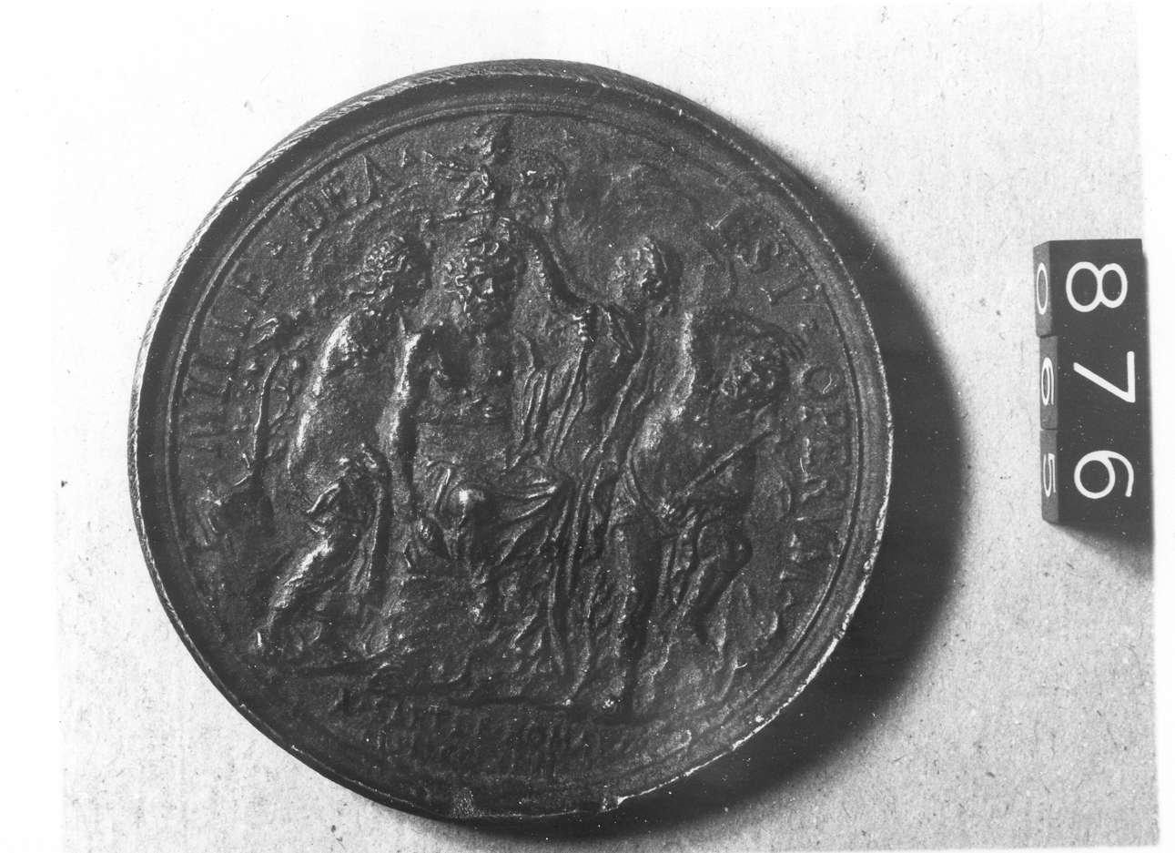 Dritto: Busto a sinistra, faccia glabra, capellilunghi e riccioluti cadenti sulle spalle. Rovescio: Giove in trono dalla cui testa sorge mInerva armata, a destra Ercole con la pelle del leone di Nemea, ai lati due dee, a sinistra albero con frutta (i pomi d'oro?)