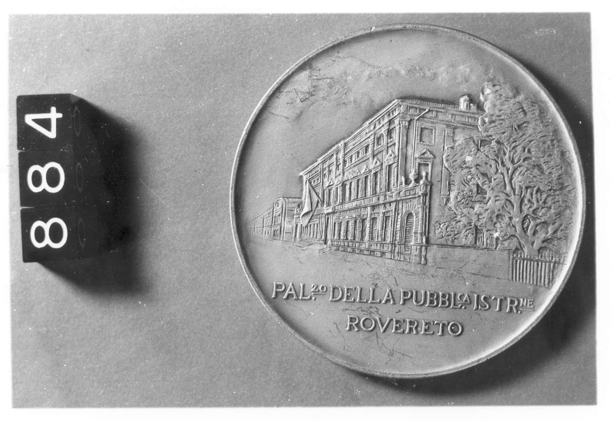 Dritto: Busto di 3/4 a destra con pizzo e baffi, occhialetti sul naso, fronte alta, capelli corti, giacca e camicia. Rovescio: Veduta prospettica del Palazzo della Pubblica Istruzione di Rovereto