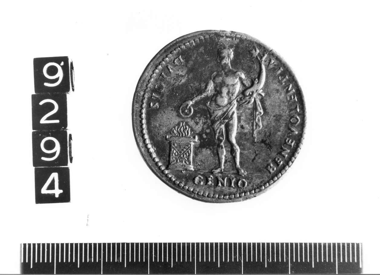 Dritto: Profili accostati di Girolamo Panico e Pompeo Ludovisi verso sinistra; il primo, una semplice camicia accollata, capelli lisci e barba liscia e corta; il secondo, una ricca casacca damascata accollata, capelli e barba ricciuti e corti. Rovescio: Allegoria della benevolenza: una figura virile seminuda verso sinistra, panneggiata alla vita, con un delfino nella sinistra, in atto di sacrificare con una patera su di un'ara fiammante in basso a sinistra