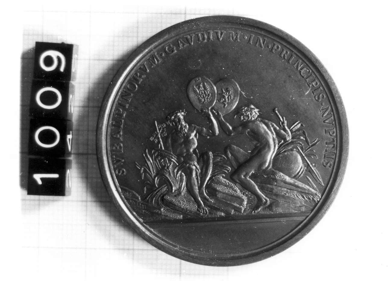 Dritto: Busto muliebre a sinistra, capelli intrecciati con fili di perle che scendono dal collo, pendente all'orecchio, veste scollata, mantello con orlo perlinato. Rovescio: Su una roccia due Fiumi seduti brandiscono scudi con l'aquila e il leone, esultanti. I fiumi Po e Reno esultano per l'unione matrimoniale